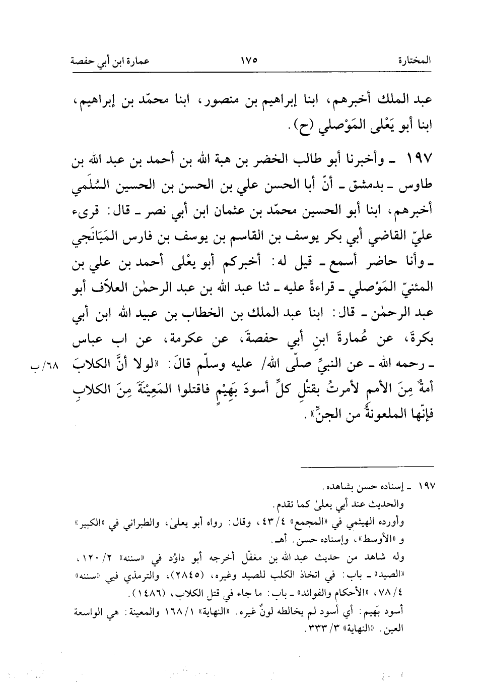 ١٩٧ - وَأَخْبَرَنَا أَبُو طَالِبٍ الْخَضِرُ بْنُ هِبَةِ اللهِ بْنِ أَحْمَدَ بْنِ عَبْدِ اللهِ بْنِ طَاوُسٍ - بِدِمَشْقَ - أَنَّ أَبَا الْحَسَنِ عَلِيَّ بْنَ الْحَسَنِ بْنِ الْحُسَيْنِ السُّلَمِيَّ أَخْبَرَهُمْ، أَبْنَا أَبُو الْحُسَيْنِ مُحَمَّدُ بْنُ عُثْمَانَ ابْنِ أَبِي نَصْرٍ، قَالَ: قُرِئَ عَلَى الْقَاضِي أَبِي بَكْرٍ يُوسُفَ بْنِ الْقَاسِمِ بْنِ يُوسُفَ بْنِ فَارِسٍ الْمَيَانَجِيِّ - وَأَنَا حَاضِرٌ أَسْمَعُ - قِيلَ لَهُ: أَخْبَرَكُمْ أَبُو يَعْلَى أَحْمَدُ بْنُ عَلِيِّ بْنِ الْمُثَنَّى الْمَوْصِلِيُّ - قِرَاءَةً عَلَيْهِ - ثَنَا عَبْدُ اللهِ بْنُ عَبْدِ الرَّحْمَنِ الْعَلَّافُ أَبُو عَبْدِ الرَّحْمَنِ، قَالَ: أَبْنَا عَبْدُ الْمَلِكِ بْنُ الْخَطَّابِ بْنِ عُبَيْدِ اللهِ، ابْنُ أَبِي بَكْرَةَ، عَنْ عُمَارَةَ ابْنِ أَبِي حَفْصَةَ، عَنْ عِكْرِمَةَ، عَنِ ابْنِ عَبَّاسٍ - رَحِمَهُ اللهُ - عَنِ النَّبِيِّ - صَلَّى اللهُ عَلَيْهِ وَسَلَّمَ - قَالَ: «لَوْلَا أَنَّ الْكِلَابَ أُمَّةٌ مِنَ الْأُمَمِ لَأَمَرْتُ بِقَتْلِ كُلِّ أَسْوَدَ بَهِيمٍ، فَاقْتُلُوا الْمَعِينَةَ مِنَ الْكِلَابِ فَإِنَّهَا الْمَلْعُونَةُ مِنَ الْجِنِّ».