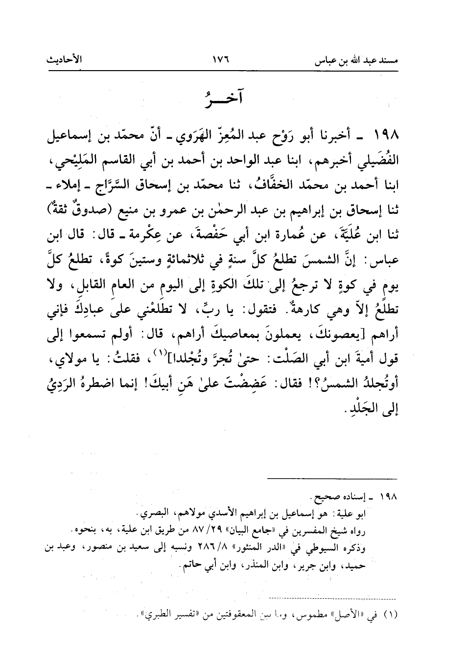 ١٩٨ - أَخْبَرَنَا أَبُو رَوْحٍ عَبْدُ الْمُعِزِّ الْهَرَوِيُّ، أَنَّ مُحَمَّدَ بْنَ إِسْمَاعِيلَ الْفُضَيْلِيَّ أَخْبَرَهُمْ، أَبْنَا عَبْدُ الْوَاحِدِ بْنُ أَحْمَدَ بْنِ أَبِي الْقَاسِمِ الْمَلِيحِيُّ، أَبْنَا أَحْمَدُ بْنُ مُحَمَّدٍ الْخَفَّافُ، ثَنَا مُحَمَّدُ بْنُ إِسْحَاقَ السَّرَّاجُ - إِمْلَاءً - ثَنَا إِسْحَاقُ بْنُ إِبْرَاهِيمَ بْنِ عَبْدِ الرَّحْمَنِ بْنِ عَمْرِو بْنِ مَنِيعٍ (صَدُوقٌ ثِقَةٌ)، ثَنَا ابْنُ عُلَيَّةَ، عَنْ عُمَارَةَ ابْنِ أَبِي حَفْصَةَ، عَنْ عِكْرِمَةَ، قَالَ: قَالَ ابْنُ عَبَّاسٍ: «إِنَّ الشَّمْسَ تَطْلُعُ كُلَّ سَنَةٍ فِي ثَلَاثِمِائَةٍ وَسِتِّينَ كَوَّةً، تَطْلُعُ كُلَّ يَوْمٍ فِي كَوَّةٍ لَا تَرْجِعُ إِلَى تِلْكَ الْكَوَّةِ إِلَى الْيَوْمِ مِنَ الْعَامِ الْقَابِلِ، وَلَا تَطْلُعُ إِلَّا وَهِيَ كَارِهَةٌ. فَتَقُولُ: يَا رَبِّ، لَا تُطْلِعْنِي عَلَى عِبَادِكَ فَإِنِّي أَرَاهُمْ [يَعْصُونَكَ، يَعْمَلُونَ بِمَعَاصِيكَ أَرَاهُمْ، قَالَ: أَوَلَمْ تَسْمَعُوا إِلَى قَوْلِ أُمَيَّةَ ابْنِ أَبِي الصَّلْتِ: حَتَّى تُجَرَّ وَتُجْلَدَا]، فَقُلْتُ: يَا مَوْلَايَ، أَوَتُجْلَدُ الشَّمْسُ؟ ! فَقَالَ: عَضِضْتَ عَلَى هَنِ أَبِيكَ! إِنَّمَا اضْطَرَّهُ الرَّدِيُّ إِلَى الْجَلْدِ».