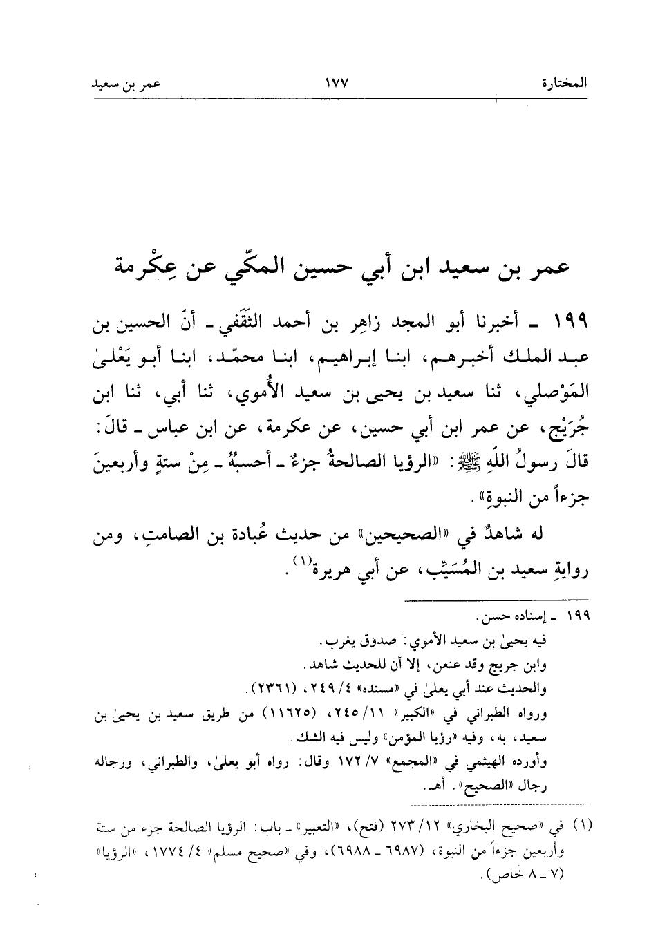 ١٩٩ - أَخْبَرَنَا أَبُو الْمَجْدِ زَاهِرُ بْنُ أَحْمَدَ الثَّقَفِيُّ، أَنَّ الْحُسَيْنَ بْنَ عَبْدِ الْمَلِكِ أَخْبَرَهُمْ، أَبْنَا إِبْرَاهِيمُ، أَبْنَا مُحَمَّدٌ، أَبْنَا أَبُو يَعْلَى الْمَوْصِلِيُّ، ثَنَا سَعِيدُ بْنُ يَحْيَى بْنِ سَعِيدٍ الْأُمَوِيُّ، ثَنَا أَبِي، ثَنَا ابْنُ جُرَيْجٍ، عَنْ عُمَرَ ابْنِ أَبِي حُسَيْنٍ، عَنْ عِكْرِمَةَ، عَنِ ابْنِ عَبَّاسٍ، قَالَ: قَالَ رَسُولُ اللهِ صَلَّى اللهُ عَلَيْهِ وَسَلَّمَ: «الرُّؤْيَا الصَّالِحَةُ جُزْءٌ - أَحْسَبُهُ - مِنْ سِتَّةٍ وَأَرْبَعِينَ جُزْءًا مِنَ النُّبُوَّةِ».