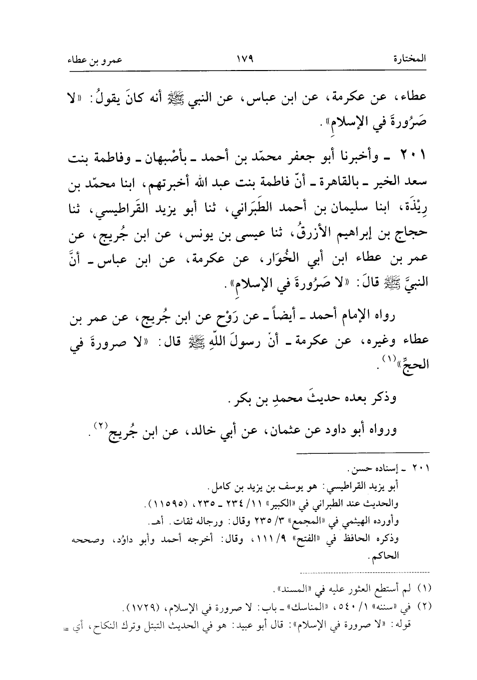 ٢٠١ - وَأَخْبَرَنَا أَبُو جَعْفَرٍ مُحَمَّدُ بْنُ أَحْمَدَ - بِأَصْبَهَانَ - وَفَاطِمَةُ بِنْتُ سَعْدِ الْخَيْرِ - بِالْقَاهِرَةِ - أَنَّ فَاطِمَةَ بِنْتَ عَبْدِ اللهِ أَخْبَرَتْهُمْ، أَبْنَا مُحَمَّدُ بْنُ رِيذَةَ، أَبْنَا سُلَيْمَانُ بْنُ أَحْمَدَ الطَّبَرَانِيُّ، ثَنَا أَبُو يَزِيدَ الْقَرَاطِيسِيُّ. ثَنَا حَجَّاجُ بْنُ إِبْرَاهِيمَ الْأَزْرَقُ، ثَنَا عِيسَى بْنُ يُونُسَ، عَنِ ابْنِ جُرَيْجٍ. عَنْ عُمَرَ بْنِ عَطَاءِ ابْنِ أَبِي الْخُوَارِ، عَنْ عِكْرِمَةَ، عَنِ ابْنِ عَبَّاسٍ، أَنَّ النَّبِيَّ - صَلَّى اللهُ عَلَيْهِ وَسَلَّمَ - قَالَ: «لَا صَرُورَةَ فِي الْإِسْلَامِ».
