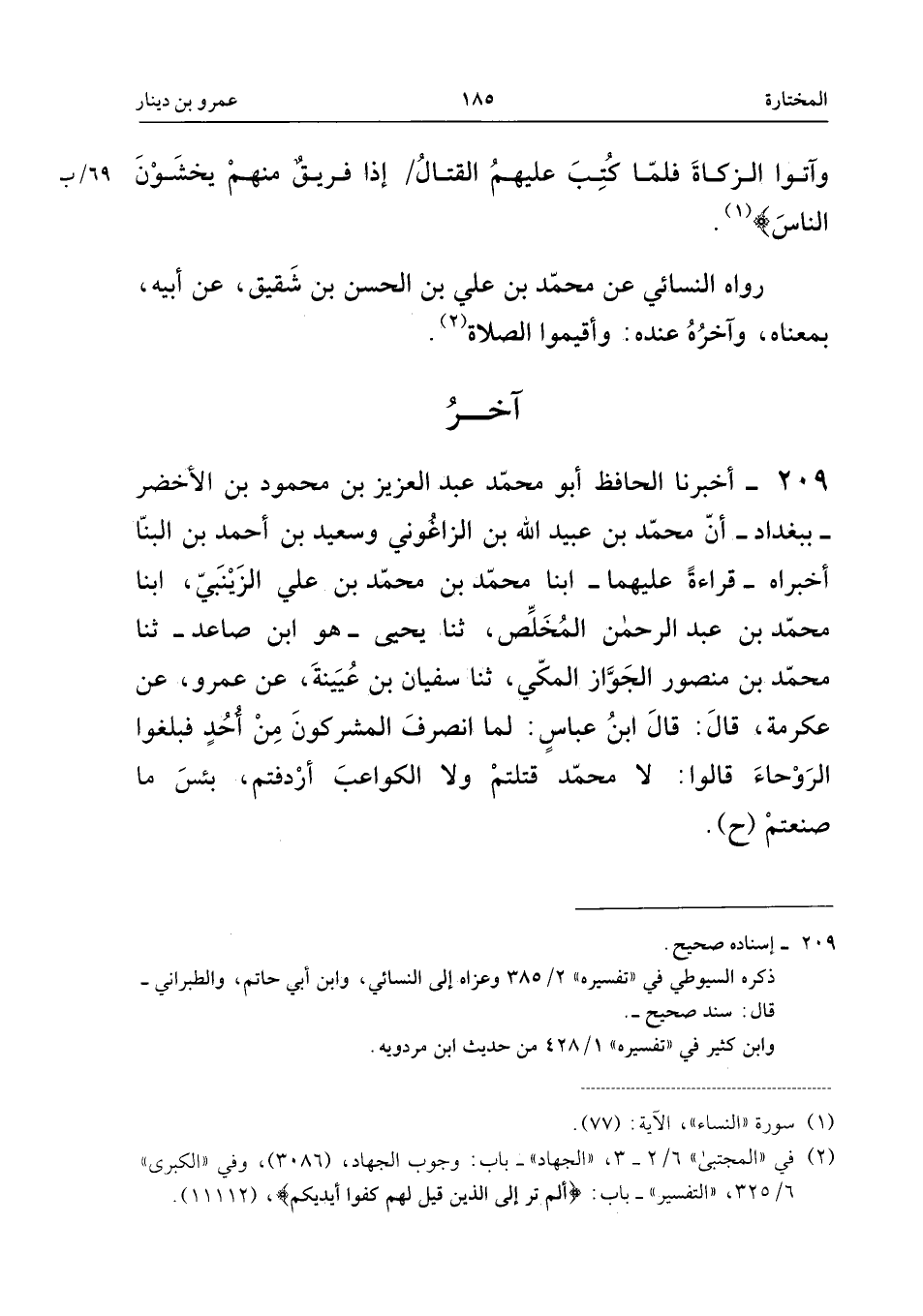 ٢٠٩ - أَخْبَرَنَا الْحَافِظُ أَبُو مُحَمَّدٍ عَبْدُ الْعَزِيزِ بْنُ مَحْمُودِ بْنِ الْأَخْضَرِ - بِبَغْدَادَ - أَنَّ مُحَمَّدَ بْنَ عُبَيْدِ اللهِ بْنِ الزَّاغُونِيِّ وَسَعِيدَ بْنَ أَحْمَدَ بْنِ الْبَنَّا أَخْبَرَاهُ - قِرَاءَةً عَلَيْهِمَا - أَبْنَا مُحَمَّدُ بْنُ مُحَمَّدِ بْنِ عَلِيٍّ الزَّيْنَبِيُّ، أَبْنَا مُحَمَّدُ بْنُ عَبْدِ الرَّحْمَنِ الْمُخَلِّصُ، ثَنَا يَحْيَى - هُوَ ابْنُ صَاعِدٍ - ثَنَا مُحَمَّدُ بْنُ مَنْصُورٍ الْجَوَّازُ الْمَكِّيُّ، ثَنَا سُفْيَانُ بْنُ عُيَيْنَةَ، عَنْ عَمْرٍو، عَنْ عِكْرِمَةَ، قَالَ: قَالَ ابْنُ عَبَّاسٍ: «لَمَّا انْصَرَفَ الْمُشْرِكُونَ مِنْ أُحُدٍ فَبَلَغُوا الرَّوْحَاءَ قَالُوا: لَا مُحَمَّدٌ قَتَلْتُمْ وَلَا الْكَوَاعِبُ أَرْدَفْتُمْ، بِئْسَ مَا صَنَعْتُمْ» (ح).