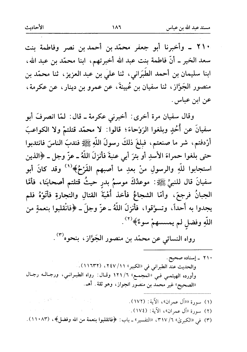 ٢١٠ - وَأَخْبَرَنَا أَبُو جَعْفَرٍ مُحَمَّدُ بْنُ أَحْمَدَ بْنِ نَصْرٍ وَفَاطِمَةُ بِنْتُ سَعْدِ الْخَيْرِ، أَنَّ فَاطِمَةَ بِنْتَ عَبْدِ اللهِ أَخْبَرَتْهُمْ، أَبْنَا مُحَمَّدُ بْنُ عَبْدِ اللهِ، أَبْنَا سُلَيْمَانُ بْنُ أَحْمَدَ الطَّبَرَانِيُّ، ثَنَا عَلِيُّ بْنُ عَبْدِ الْعَزِيزِ، ثَنَا مُحَمَّدُ بْنُ مَنْصُورٍ الْجَوَّازُ، ثَنَا سُفْيَانُ بْنُ عُيَيْنَةَ، عَنْ عَمْرِو بْنِ دِينَارٍ، عَنْ عِكْرِمَةَ، عَنِ ابْنِ عَبَّاسٍ.