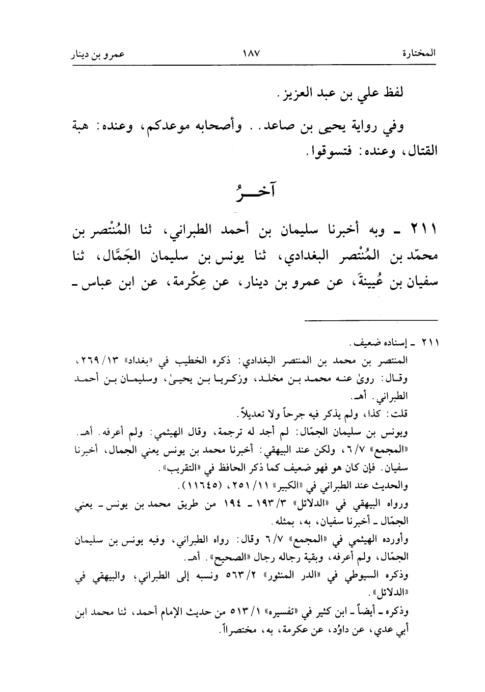٢١١ - وَبِهِ أَخْبَرَنَا سُلَيْمَانُ بْنُ أَحْمَدَ الطَّبَرَانِيُّ، ثَنَا الْمُنْتَصِرُ بْنُ مُحَمَّدِ بْنِ الْمُنْتَصِرِ الْبَغْدَادِيُّ، ثَنَا يُونُسُ بْنُ سُلَيْمَانَ الْجَمَّالُ، ثَنَا سُفْيَانُ بْنُ عُيَيْنَةَ، عَنْ عَمْرِو بْنِ دِينَارٍ، عَنْ عِكْرِمَةَ، عَنِ ابْنِ عَبَّاسٍ،
