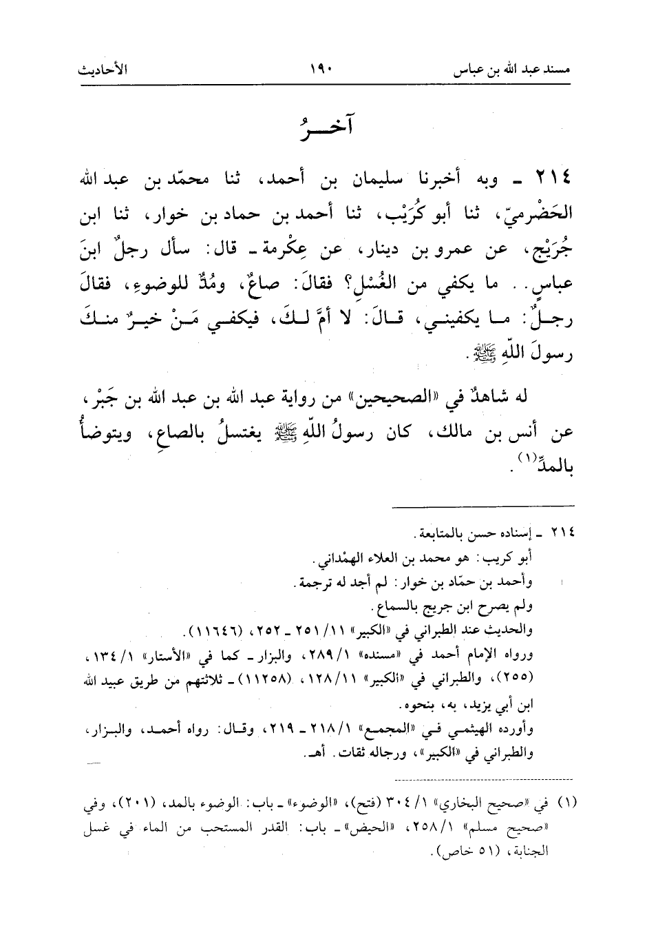 ٢١٤ - وَبِهِ أَخْبَرَنَا سُلَيْمَانُ بْنُ أَحْمَدَ، ثَنَا مُحَمَّدُ بْنُ عَبْدِ اللهِ الْحَضْرَمِيُّ، ثَنَا أَبُو كُرَيْبٍ، ثَنَا أَحْمَدُ بْنُ حَمَّادِ بْنِ خُوَارٍ، ثَنَا ابْنُ جُرَيْجٍ، عَنْ عَمْرِو بْنِ دِينَارٍ، عَنْ عِكْرِمَةَ، قَالَ: «سَأَلَ رَجُلٌ ابْنَ عَبَّاسٍ: مَا يَكْفِي مِنَ الْغُسْلِ؟ فَقَالَ: صَاعٌ، وَمُدٌّ لِلْوُضُوءِ، فَقَالَ رَجُلٌ: مَا يَكْفِينِي. قَالَ: لَا أُمَّ لَكَ، فَيَكْفِي مَنْ خَيْرٌ مِنْكَ، رَسُولَ اللهِ صَلَّى اللهُ عَلَيْهِ وَسَلَّمَ».