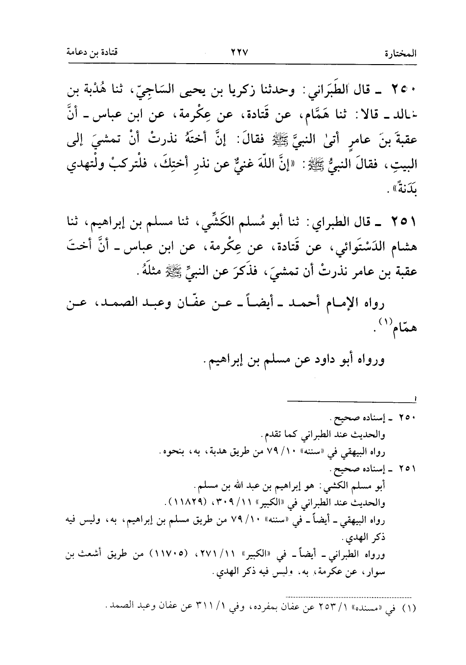 ٢٥٠ - قَالَ الطَّبَرَانِيُّ: وَحَدَّثَنَا زَكَرِيَّا بْنُ يَحْيَى السَّاجِيُّ، ثَنَا هُدْبَةُ بْنُ خَالِدٍ، قَالَا: ثَنَا هَمَّامٌ، عَنْ قَتَادَةَ، عَنْ عِكْرِمَةَ، عَنِ ابْنِ عَبَّاسٍ، «أَنَّ عُقْبَةَ بْنَ عَامِرٍ أَتَى النَّبِيَّ صَلَّى اللهُ عَلَيْهِ وَسَلَّمَ، فَقَالَ: إِنَّ أُخْتَهُ نَذَرَتْ أَنْ تَمْشِيَ إِلَى الْبَيْتِ، فَقَالَ النَّبِيُّ صَلَّى اللهُ عَلَيْهِ وَسَلَّمَ: إِنَّ اللهَ غَنِيٌّ عَنْ نَذْرِ أُخْتِكَ، فَلْتَرْكَبْ وَلْتُهْدِ بَدَنَةً».