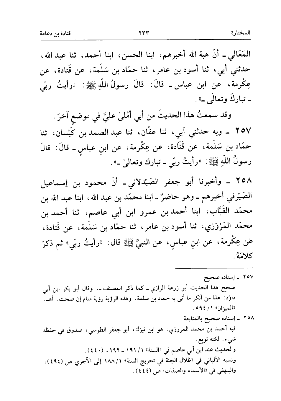 ٢٥٨ - وَأَخْبَرَنَا أَبُو جَعْفَرٍ الصَّيْدَلَانِيُّ، أَنَّ مَحْمُودَ بْنَ إِسْمَاعِيلَ الصَّيْرَفِيَّ أَخْبَرَهُمْ - وَهُوَ حَاضِرٌ - أَبْنَا مُحَمَّدُ بْنُ عَبْدِ اللهِ، أَبْنَا عَبْدُ اللهِ بْنُ مُحَمَّدٍ الْقَبَّابُ، أَبْنَا أَحْمَدُ بْنُ عَمْرِو ابْنِ أَبِي عَاصِمٍ، ثَنَا أَحْمَدُ بْنُ مُحَمَّدٍ الْمَرْوَزِيُّ، ثَنَا أَسْوَدُ بْنُ عَامِرٍ، ثَنَا حَمَّادُ بْنُ سَلَمَةَ، عَنْ قَتَادَةَ، عَنْ عِكْرِمَةَ، عَنِ ابْنِ عَبَّاسٍ، عَنِ النَّبِيِّ - صَلَّى اللهُ عَلَيْهِ وَسَلَّمَ - قَالَ: «رَأَيْتُ رَبِّي» ثُمَّ ذَكَرَ كَلَامَهُ.