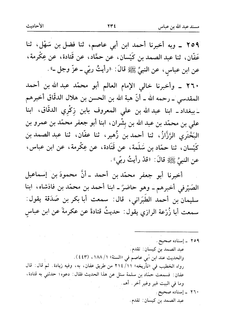 ٢٥٩ - وَبِهِ أَخْبَرَنَا أَحْمَدُ ابْنُ أَبِي عَاصِمٍ، ثَنَا فَضْلُ بْنُ سَهْلٍ، ثَنَا عَفَّانُ، ثَنَا عَبْدُ الصَّمَدِ بْنُ كَيْسَانَ، عَنْ حَمَّادٍ، عَنْ قَتَادَةَ، عَنْ عِكْرِمَةَ، عَنِ ابْنِ عَبَّاسٍ، عَنِ النَّبِيِّ - صَلَّى اللهُ عَلَيْهِ وَسَلَّمَ - قَالَ: «رَأَيْتُ رَبِّي عَزَّ وَجَلَّ».