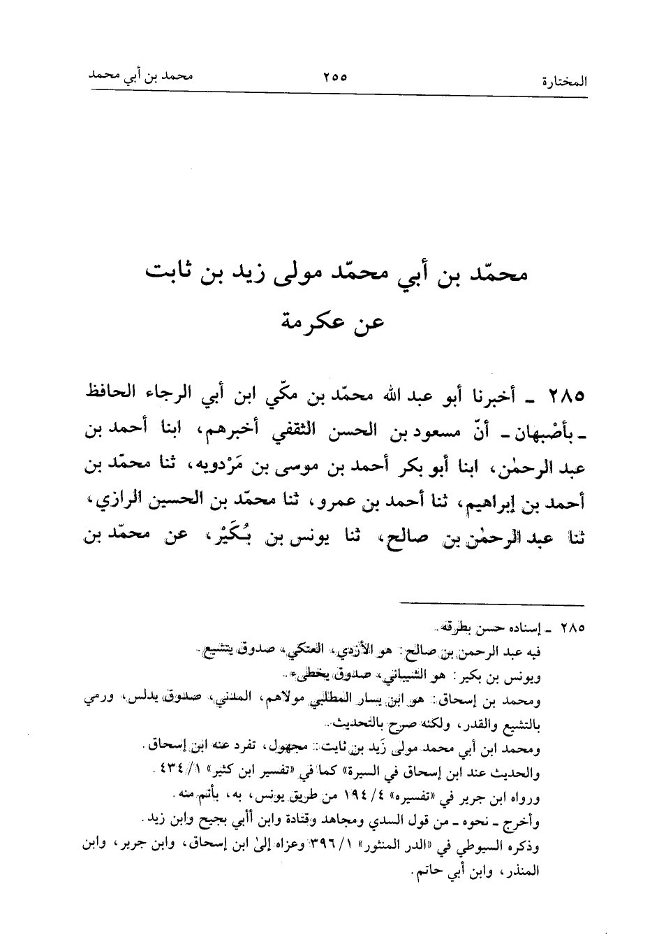 ٢٨٥ - أَخْبَرَنَا أَبُو عَبْدِ اللهِ مُحَمَّدُ بْنُ مَكِّيِّ ابْنِ أَبِي الرَّجَاءِ الْحَافِظُ - بِأَصْبَهَانَ - أَنَّ مَسْعُودَ بْنَ الْحَسَنِ الثَّقَفِيَّ أَخْبَرَهُمْ، أَبْنَا أَحْمَدُ بْنُ عَبْدِ الرَّحْمَنِ، أَبْنَا أَبُو بَكْرٍ أَحْمَدُ بْنُ مُوسَى بْنِ مَرْدُوَيْهِ، ثَنَا مُحَمَّدُ بْنُ أَحْمَدَ بْنِ إِبْرَاهِيمَ، ثَنَا أَحْمَدُ بْنُ عَمْرٍو، ثَنَا مُحَمَّدُ بْنُ الْحُسَيْنِ الرَّازِيُّ، ثَنَا عَبْدُ الرَّحْمَنِ بْنُ صَالِحٍ، ثَنَا يُونُسُ بْنُ بُكَيْرٍ، عَنْ مُحَمَّدِ بْنِ