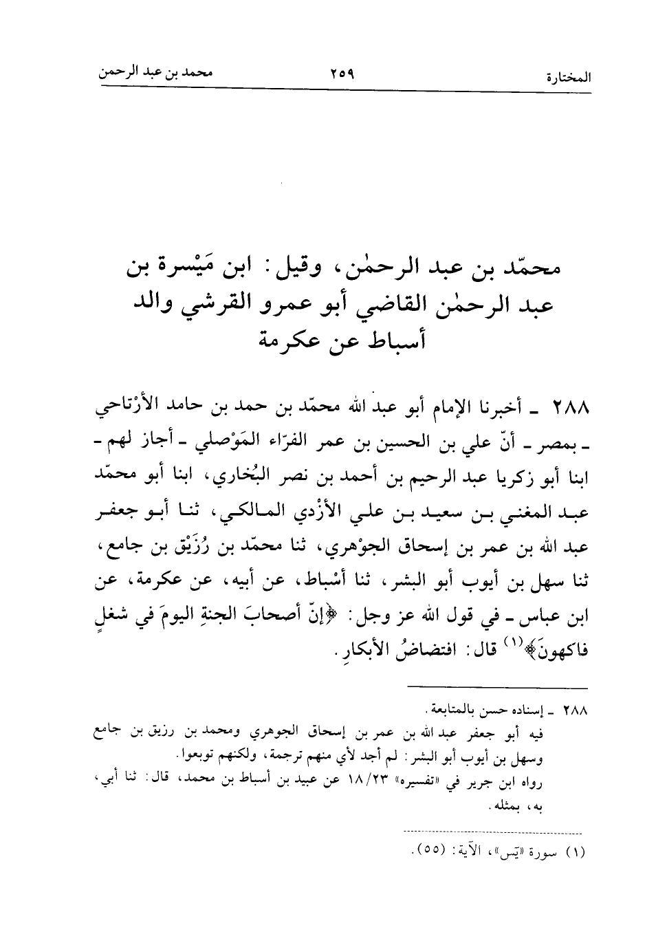 ٢٨٨ - أَخْبَرَنَا الْإِمَامُ أَبُو عَبْدِ اللهِ مُحَمَّدُ بْنُ حَمَدِ بْنِ حَامِدٍ الْأَرْتَاحِيُّ - بِمِصْرَ - أَنَّ عَلِيَّ بْنَ الْحُسَيْنِ بْنِ عُمَرَ الْفَرَّاءَ الْمَوْصِلِيَّ - أَجَازَ لَهُمْ - أَبْنَا أَبُو زَكَرِيَّا عَبْدُ الرَّحِيمِ بْنُ أَحْمَدَ بْنِ نَصْرٍ الْبُخَارِيُّ، أَبْنَا أَبُو مُحَمَّدٍ عَبْدُ الْمُغْنِي بْنُ سَعِيدِ بْنِ عَلِيٍّ الْأَزْدِيُّ الْمَالِكِيُّ، ثَنَا أَبُو جَعْفَرٍ عَبْدُ اللهِ بْنُ عُمَرَ بْنِ إِسْحَاقَ الْجَوْهَرِيُّ، ثَنَا مُحَمَّدُ بْنُ رُزَيْقِ بْنِ جَامِعٍ، ثَنَا سَهْلُ بْنُ أَيُّوبَ أَبُو الْبِشْرِ، ثَنَا أَسْبَاطٌ، عَنْ أَبِيهِ، عَنْ عِكْرِمَةَ، عَنِ ابْنِ عَبَّاسٍ - «فِي قَوْلِ اللهِ عَزَّ وَجَلَّ: {إِنَّ أَصْحَابَ الْجَنَّةِ الْيَوْمَ فِي شُغُلٍ فَاكِهُونَ}، قَالَ: افْتِضَاضُ الْأَبْكَارِ».