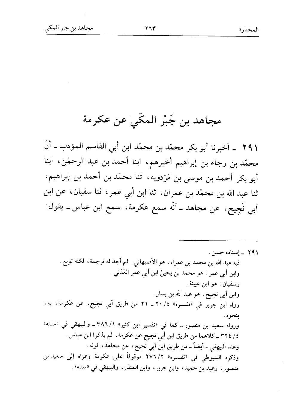 ٢٩١ - أَخْبَرَنَا أَبُو بَكْرٍ مُحَمَّدُ بْنُ مُحَمَّدِ ابْنِ أَبِي الْقَاسِمِ الْمُؤَدِّبُ، أَنَّ مُحَمَّدَ بْنَ رَجَاءِ بْنِ إِبْرَاهِيمَ أَخْبَرَهُمْ، أَبْنَا أَحْمَدُ بْنُ عَبْدِ الرَّحْمَنِ، أَبْنَا أَبُو بَكْرٍ أَحْمَدُ بْنُ مُوسَى بْنِ مَرْدُوَيْهِ، ثَنَا مُحَمَّدُ بْنُ أَحْمَدَ بْنِ إِبْرَاهِيمَ، ثَنَا عَبْدُ اللهِ بْنُ مُحَمَّدِ بْنِ عِمْرَانَ، ثَنَا ابْنُ أَبِي عُمَرَ، ثَنَا سُفْيَانُ، عَنِ ابْنِ أَبِي نَجِيحٍ، عَنْ مُجَاهِدٍ - أَنَّهُ سَمِعَ عِكْرِمَةَ، سَمِعَ ابْنَ عَبَّاسٍ - يَقُولُ: