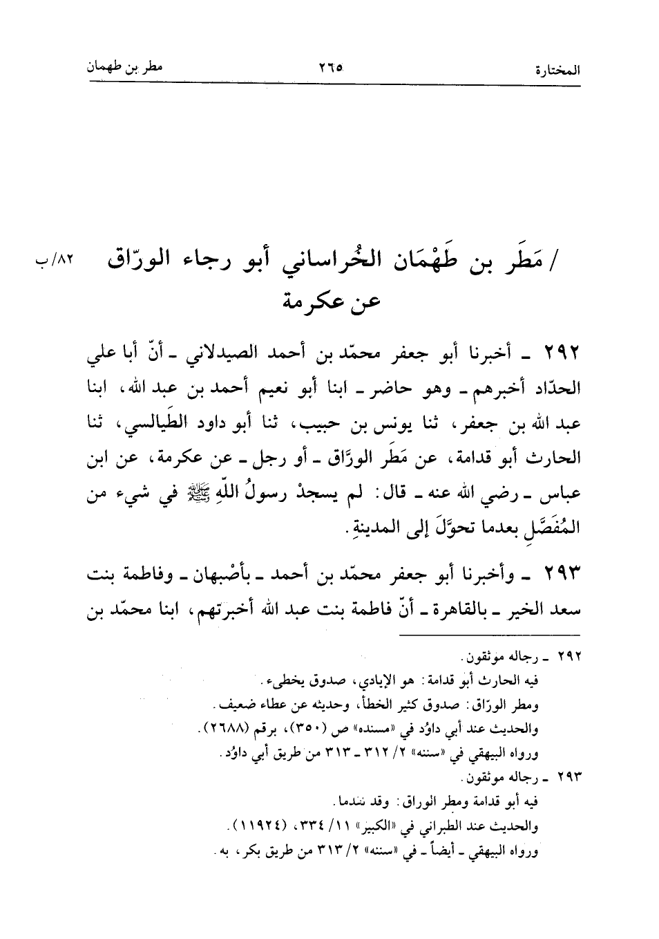 ٢٩٢ - أَخْبَرَنَا أَبُو جَعْفَرٍ مُحَمَّدُ بْنُ أَحْمَدَ الصَّيْدَلَانِيُّ، أَنَّ أَبَا عَلِيٍّ الْحَدَّادَ أَخْبَرَهُمْ - وَهُوَ حَاضِرٌ - أَبْنَا أَبُو نُعَيْمٍ أَحْمَدُ بْنُ عَبْدِ اللهِ، أَبْنَا عَبْدُ اللهِ بْنُ جَعْفَرٍ، ثَنَا يُونُسُ بْنُ حَبِيبٍ، ثَنَا أَبُو دَاوُدَ الطَّيَالِسِيُّ، ثَنَا الْحَارِثُ أَبُو قُدَامَةَ، عَنْ مَطَرٍ الْوَرَّاقِ - أَوْ رَجُلٍ - عَنْ عِكْرِمَةَ، عَنِ ابْنِ عَبَّاسٍ - رَضِيَ اللهُ عَنْهُ - قَالَ: «لَمْ يَسْجُدْ رَسُولُ اللهِ - صَلَّى اللهُ عَلَيْهِ وَسَلَّمَ - فِي شَيْءٍ مِنَ الْمُفَصَّلِ بَعْدَمَا تَحَوَّلَ إِلَى الْمَدِينَةِ».