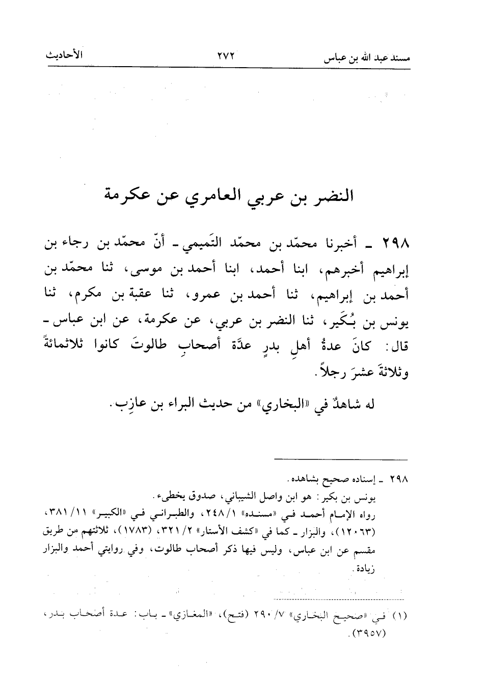 ٢٩٨ - أَخْبَرَنَا مُحَمَّدُ بْنُ مُحَمَّدٍ التَّمِيمِيُّ، أَنَّ مُحَمَّدَ بْنَ رَجَاءِ بْنِ إِبْرَاهِيمَ أَخْبَرَهُمْ، أَبْنَا أَحْمَدُ، أَبْنَا أَحْمَدُ بْنُ مُوسَى، ثَنَا مُحَمَّدُ بْنُ أَحْمَدَ بْنِ إِبْرَاهِيمَ، ثَنَا أَحْمَدُ بْنُ عَمْرٍو، ثَنَا عُقْبَةُ بْنُ مُكْرَمٍ، ثَنَا يُونُسُ بْنُ بُكَيْرٍ، ثَنَا النَّضْرُ بْنُ عَرَبِيٍّ، عَنْ عِكْرِمَةَ، عَنِ ابْنِ عَبَّاسٍ، قَالَ: «كَانَ عِدَّةُ أَهْلِ بَدْرٍ عِدَّةَ أَصْحَابِ طَالُوتَ، كَانُوا ثَلَاثَمِائَةٍ وَثَلَاثَةَ عَشَرَ رَجُلًا».