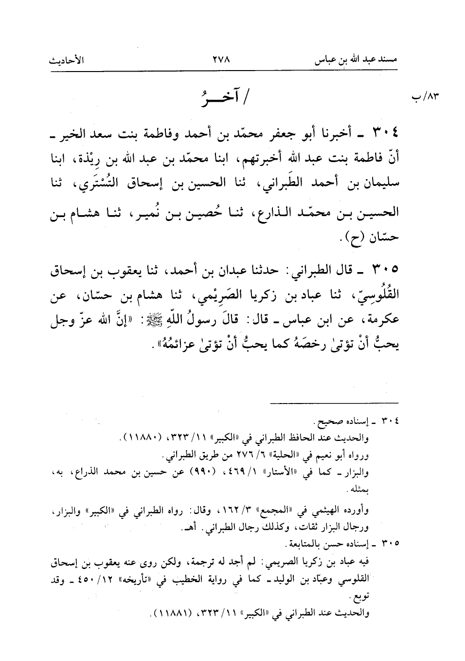 ٣٠٥ - قَالَ الطَّبَرَانِيُّ: حَدَّثَنَا عَبْدَانُ بْنُ أَحْمَدَ، ثَنَا يَعْقُوبُ بْنُ إِسْحَاقَ الْقُلُوسِيُّ، ثَنَا عَبَّادُ بْنُ زَكَرِيَّا الصَّرِيمِيُّ، ثَنَا هِشَامُ بْنُ حَسَّانَ، عَنْ عِكْرِمَةَ، عَنِ ابْنِ عَبَّاسٍ، قَالَ: قَالَ رَسُولُ اللهِ صَلَّى اللهُ عَلَيْهِ وَسَلَّمَ: «إِنَّ اللهَ عَزَّ وَجَلَّ يُحِبُّ أَنْ تُؤْتَى رُخَصُهُ كَمَا يُحِبُّ أَنْ تُؤْتَى عَزَائِمُهُ».