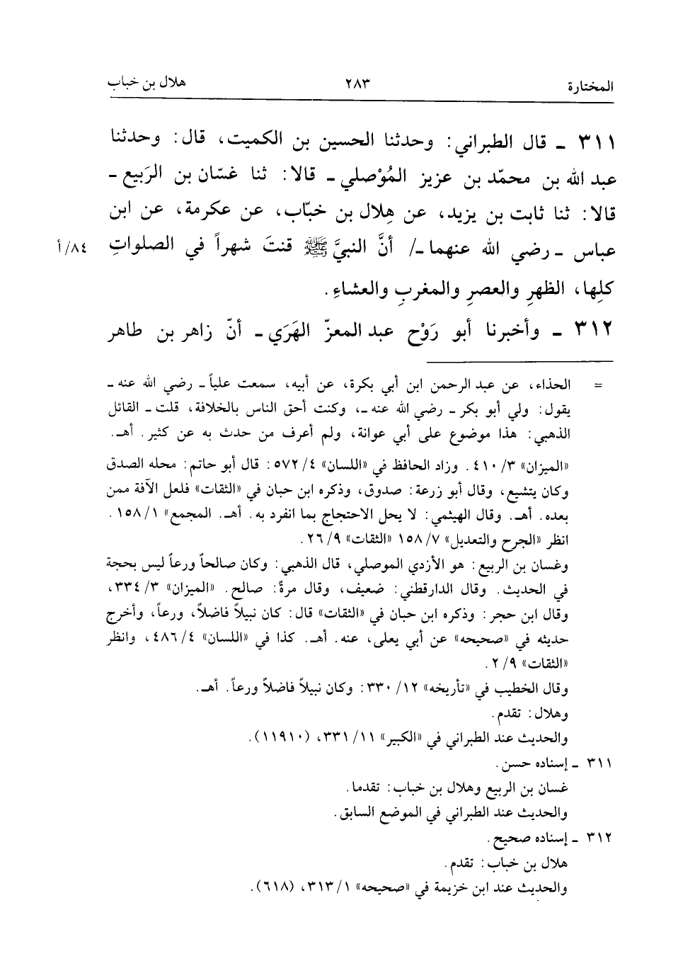 ٣١١ - قَالَ الطَّبَرَانِيُّ: وَحَدَّثَنَا الْحُسَيْنُ بْنُ الْكُمَيْتِ، قَالَ: وَحَدَّثَنَا عَبْدُ اللهِ بْنُ مُحَمَّدِ بْنِ عُزَيْزٍ الْمَوْصِلِيُّ، قَالَا: ثَنَا غَسَّانُ بْنُ الرَّبِيعِ، قَالَا: ثَنَا ثَابِتُ بْنُ زَيْدٍ، عَنْ هِلَالِ بْنِ خَبَّابٍ، عَنْ عِكْرِمَةَ، عَنِ ابْنِ عَبَّاسٍ - رَضِيَ اللهُ عَنْهُمَا - «أَنَّ النَّبِيَّ - صَلَّى اللهُ عَلَيْهِ وَسَلَّمَ - قَنَتَ شَهْرًا فِي الصَّلَوَاتِ كُلِّهَا: الظُّهْرِ وَالْعَصْرِ وَالْمَغْرِبِ وَالْعِشَاءِ».