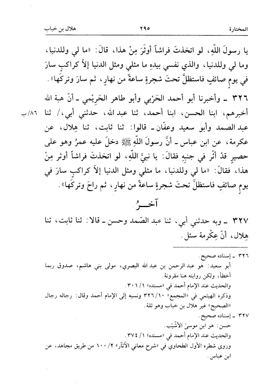 ٣٢٦ - وَأَخْبَرَنَا أَبُو أَحْمَدَ الْحَرْبِيُّ (¬١) وَأَبُو طَاهِرٍ الْحَرِيمِيُّ، أَنَّ هِبَةَ اللهِ أَخْبَرَهُمْ، أَبْنَا الْحَسَنُ، أَبْنَا أَحْمَدُ، ثَنَا عَبْدُ اللهِ، حَدَّثَنِي أَبِي، ثَنَا عَبْدُ الصَّمَدِ وَأَبُو سَعِيدٍ وَعَفَّانُ، قَالُوا: ثَنَا ثَابِتٌ، ثَنَا هِلَالٌ، عَنْ عِكْرِمَةَ، عَنِ ابْنِ عَبَّاسٍ، «أَنَّ رَسُولَ اللهِ - صَلَّى اللهُ عَلَيْهِ وَسَلَّمَ - دَخَلَ عَلَيْهِ عُمَرُ وَهُوَ عَلَى حَصِيرٍ قَدْ أَثَّرَ فِي جَنْبِهِ فَقَالَ: يَا نَبِيَّ اللهِ، لَوِ اتَّخَذْتَ فِرَاشًا أَوْثَرَ مِنْ هَذَا، فَقَالَ: مَا لِي وَلِلدُّنْيَا، مَا مَثَلِي وَمَثَلُ الدُّنْيَا إِلَّا كَرَاكِبٍ سَارَ فِي يَوْمٍ صَائِفٍ فَاسْتَظَلَّ تَحْتَ شَجَرَةٍ سَاعَةً مِنْ نَهَارٍ، ثُمَّ رَاحَ وَتَرَكَهَا».