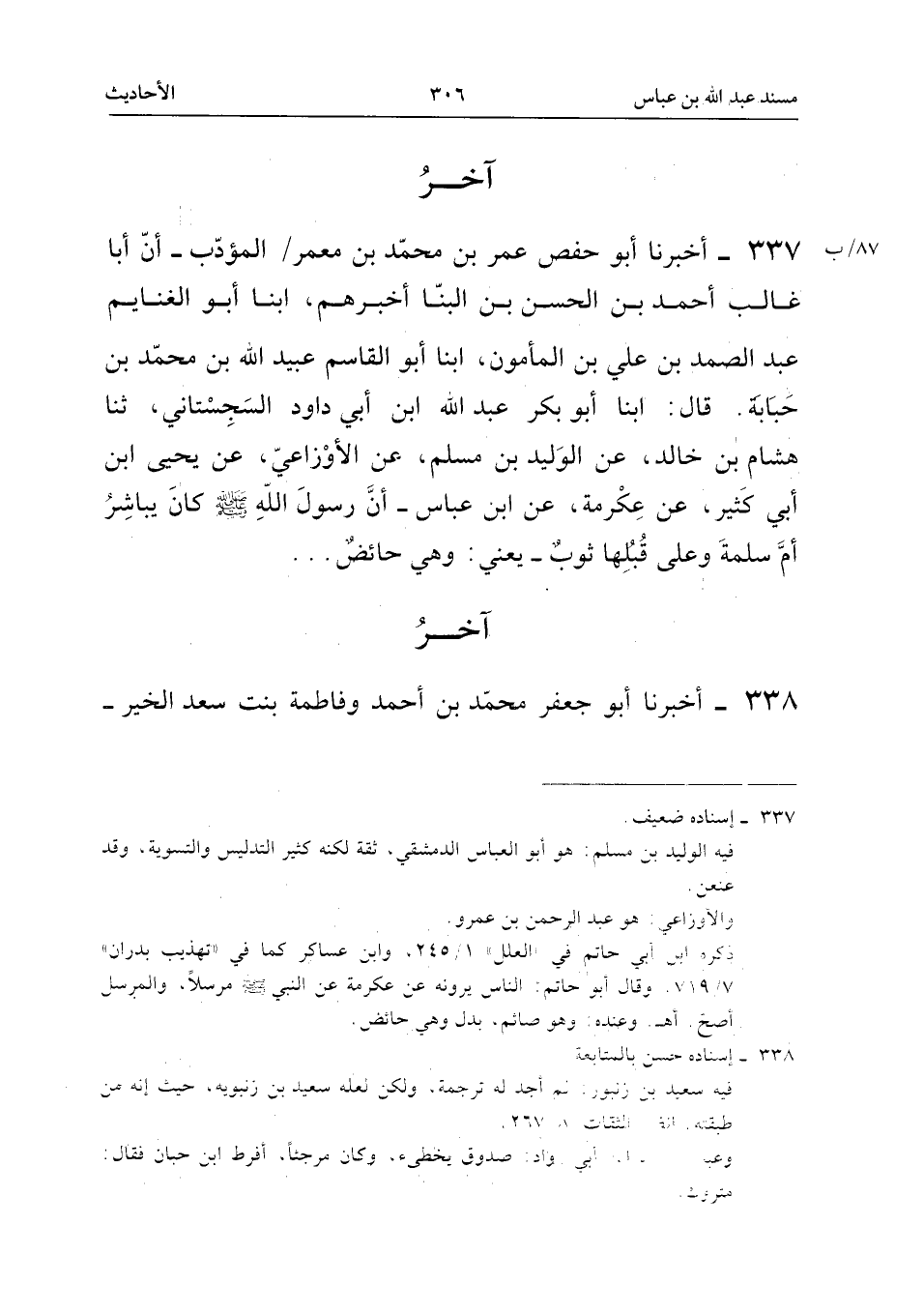 ٣٣٧ - أَخْبَرَنَا أَبُو حَفْصٍ عُمَرُ بْنُ مُحَمَّدِ بْنِ مَعْمَرٍ الْمُؤَدِّبُ، أَنَّ أَبَا غَالِبٍ أَحْمَدَ بْنَ الْحَسَنِ بْنِ الْبَنَّا أَخْبَرَهُمْ، أَبْنَا أَبُو الْغَنَايِمِ عَبْدُ الصَّمَدِ بْنُ عَلِيِّ بْنِ الْمَأْمُونِ، أَبْنَا أَبُو الْقَاسِمِ عُبَيْدُ اللهِ بْنُ مُحَمَّدِ بْنِ حَبَابَةَ. قَالَ: أَبْنَا أَبُو بَكْرٍ عَبْدُ اللهِ ابْنُ أَبِي دَاوُدَ السِّجِسْتَانِيُّ. ثَنَا هِشَامُ بْنُ خَالِدٍ عَنِ الْوَلِيدِ بْنِ مُسْلِمٍ، عَنِ الْأَوْزَاعِيِّ، عَنْ يَحْيَى ابْنِ أَبِي كَثِيرٍ، عَنْ عِكْرِمَةَ، عَنِ ابْنِ عَبَّاسٍ، «أَنَّ رَسُولَ اللهِ - صَلَّى اللهُ عَلَيْهِ وَسَلَّمَ - كَانَ يُبَاشِرُ أَمَّ سَلَمَةَ وَعَلَى قُبُلِهَا ثَوْبٌ»، يَعْنِي: وَهِيَ حَائِضٌ.