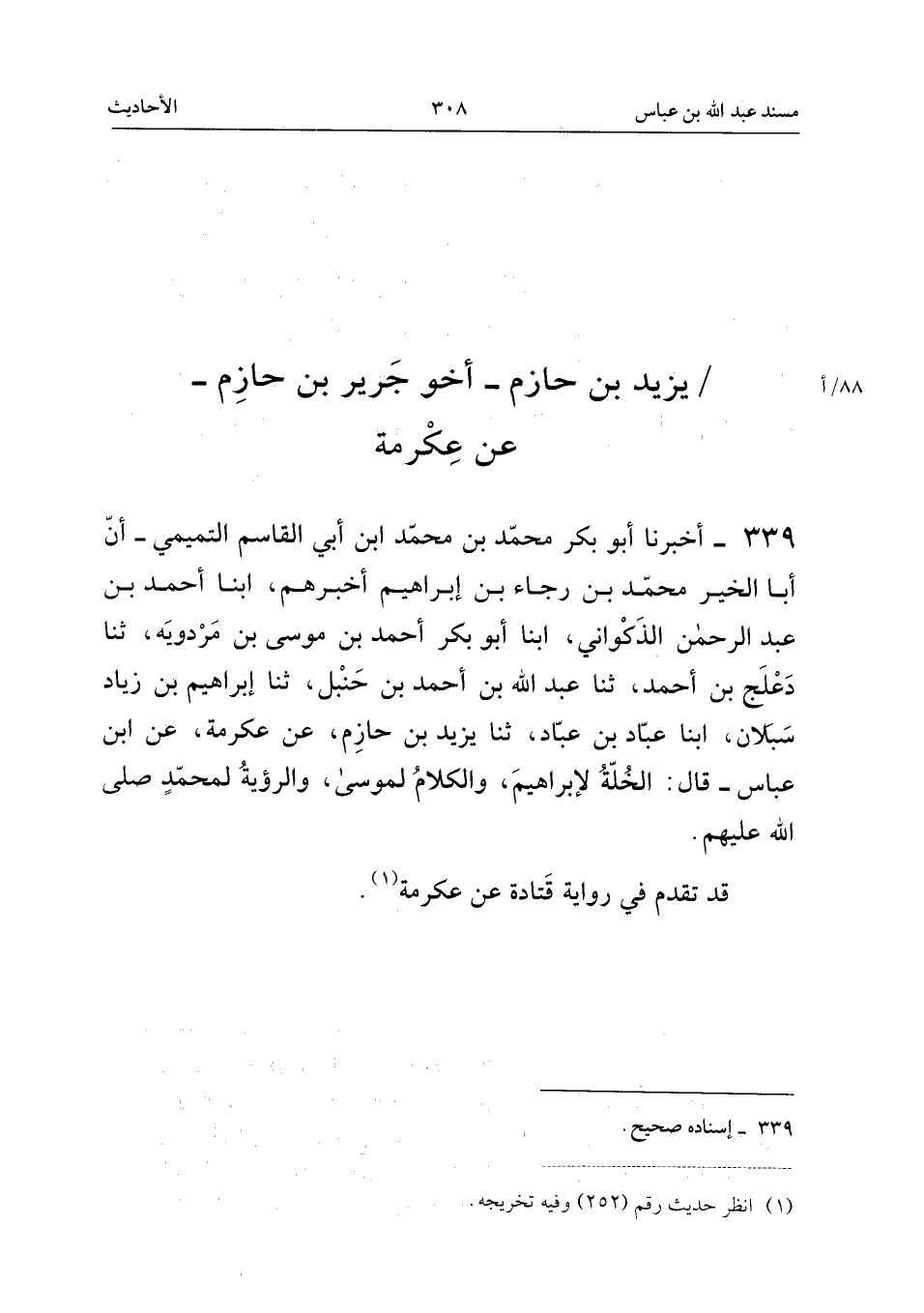 ٣٣٩ - أَخْبَرَنَا أَبُو بَكْرٍ مُحَمَّدُ بْنُ مُحَمَّدِ ابْنِ أَبِي الْقَاسِمِ التَّمِيمِيُّ، أَنَّ أَبَا الْخَيْرِ مُحَمَّدَ بْنَ رَجَاءِ بْنِ إِبْرَاهِيمَ أَخْبَرَهُمْ، أَبْنَا أَحْمَدُ بْنُ عَبْدِ الرَّحْمَنِ الذَّكْوَانِيُّ، أَبْنَا أَبُو بَكْرٍ أَحْمَدُ بْنُ مُوسَى بْنِ مَرْدُوَيْهِ، ثَنَا دَعْلَجُ بْنُ أَحْمَدَ، ثَنَا عَبْدُ اللهِ بْنُ أَحْمَدَ بْنِ حَنْبَلٍ، ثَنَا إِبْرَاهِيمُ بْنُ زِيَادٍ سَبَلَانُ، أَبْنَا عَبَّادُ بْنُ عَبَّادٍ، ثَنَا يَزِيدُ بْنُ حَازِمٍ، عَنْ عِكْرِمَةَ، عَنِ ابْنِ عَبَّاسٍ، قَالَ: «الْخُلَّةُ لِإِبْرَاهِيمَ، وَالْكَلَامُ لِمُوسَى، وَالرُّؤْيَةُ لِمُحَمَّدٍ صَلَّى اللهُ عَلَيْهِمْ».