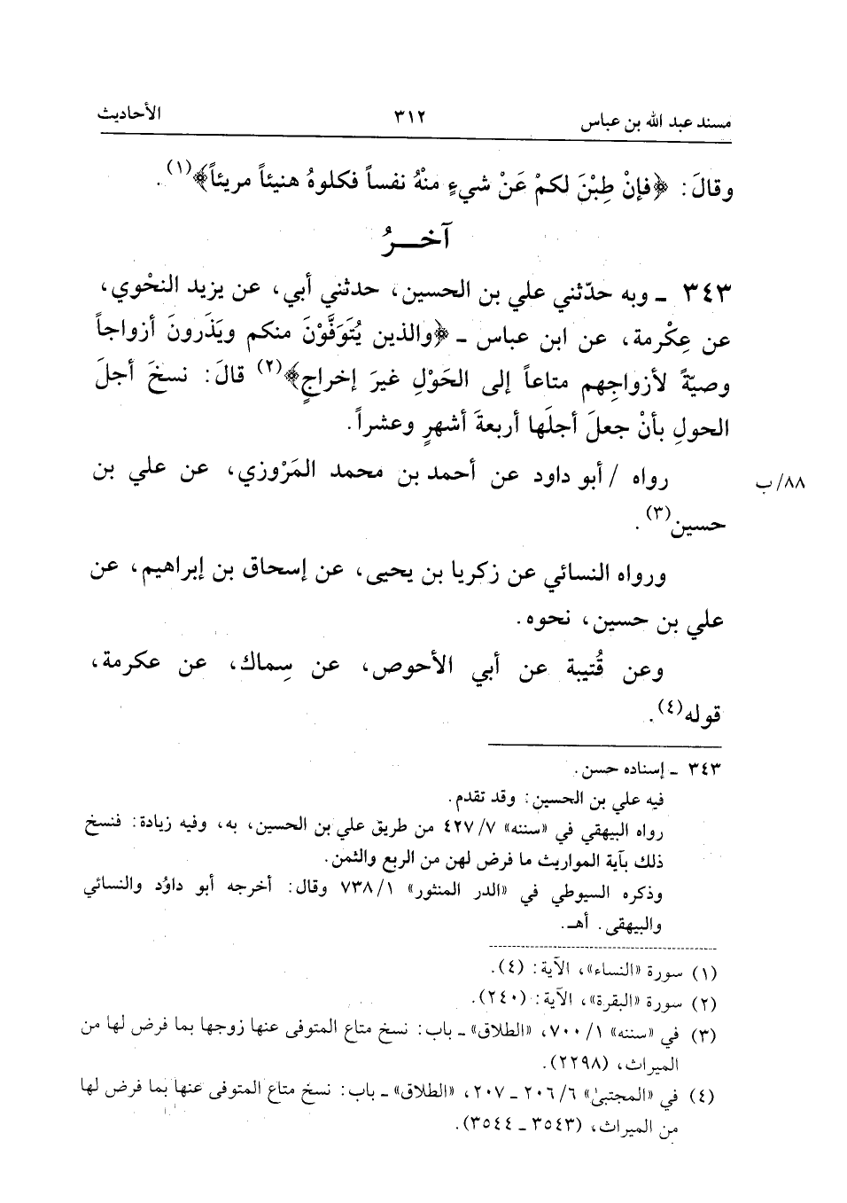 ٣٤٣ - وَبِهِ حَدَّثَنِي عَلِيُّ بْنُ الْحُسَيْنِ، حَدَّثَنِي أَبِي، عَنْ يَزِيدَ النَّحْوِيِّ، عَنْ عِكْرِمَةَ، عَنِ ابْنِ عَبَّاسٍ: «{وَالَّذِينَ يُتَوَفَّوْنَ مِنْكُمْ وَيَذَرُونَ أَزْوَاجًا وَصِيَّةً لأَزْوَاجِهِمْ مَتَاعًا إِلَى الْحَوْلِ غَيْرَ إِخْرَاجٍ}، قَالَ: نُسِخَ أَجَلَ الْحَوْلِ بِأَنْ جُعِلَ أَجَلُهَا أَرْبَعَةَ أَشْهُرٍ وَعَشْرًا».