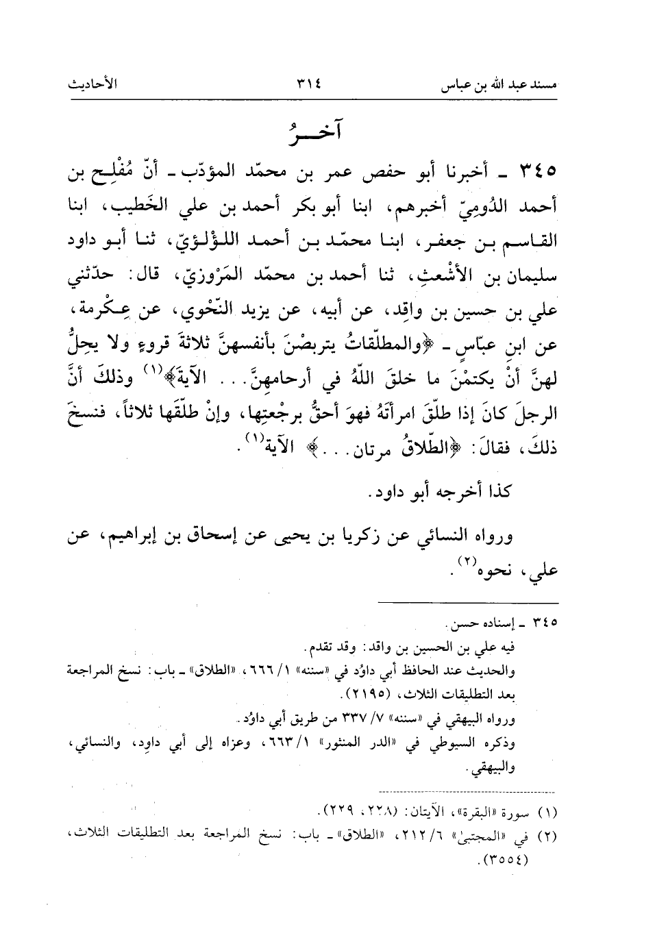 ٣٤٥ - أَخْبَرَنَا أَبُو حَفْصٍ عُمَرُ بْنُ مُحَمَّدٍ الْمُؤَدِّبُ، أَنَّ مُفْلِحَ بْنَ أَحْمَدَ الدُّومِيَّ أَخْبَرَهُمْ، أَبْنَا أَبُو بَكْرٍ أَحْمَدُ بْنُ عَلِيٍّ الْخَطِيبُ، أَبْنَا الْقَاسِمُ بْنُ جَعْفَرٍ، أَبْنَا مُحَمَّدُ بْنُ أَحْمَدَ اللُّؤْلُؤِيُّ، ثَنَا أَبُو دَاوُدَ سُلَيْمَانُ بْنُ الْأَشْعَثِ، ثَنَا أَحْمَدُ بْنُ مُحَمَّدٍ الْمَرْوَزِيُّ، قَالَ: حَدَّثَنِي عَلِيُّ بْنُ حُسَيْنِ بْنِ وَاقِدٍ، عَنْ أَبِيهِ، عَنْ يَزِيدَ النَّحْوِيِّ، عَنْ عِكْرِمَةَ، عَنِ ابْنِ عَبَّاسٍ - «{وَالْمُطَلَّقَاتُ يَتَرَبَّصْنَ بِأَنْفُسِهِنَّ ثَلاثَةَ قُرُوءٍ وَلا يَحِلُّ لَهُنَّ أَنْ يَكْتُمْنَ مَا خَلَقَ اللهُ فِي أَرْحَامِهِنَّ} ... الْآيَةَ، وَذَلِكَ أَنَّ الرَّجُلَ كَانَ إِذَا طَلَّقَ امْرَأَتَهُ فَهُوَ أَحَقُّ بِرَجْعَتِهَا، وَإِنْ طَلَّقَهَا ثَلَاثًا، فَنُسِخَ ذَلِكَ، فَقَالَ: {الطَّلاقُ مَرَّتَانِ} ... الْآيَةَ».