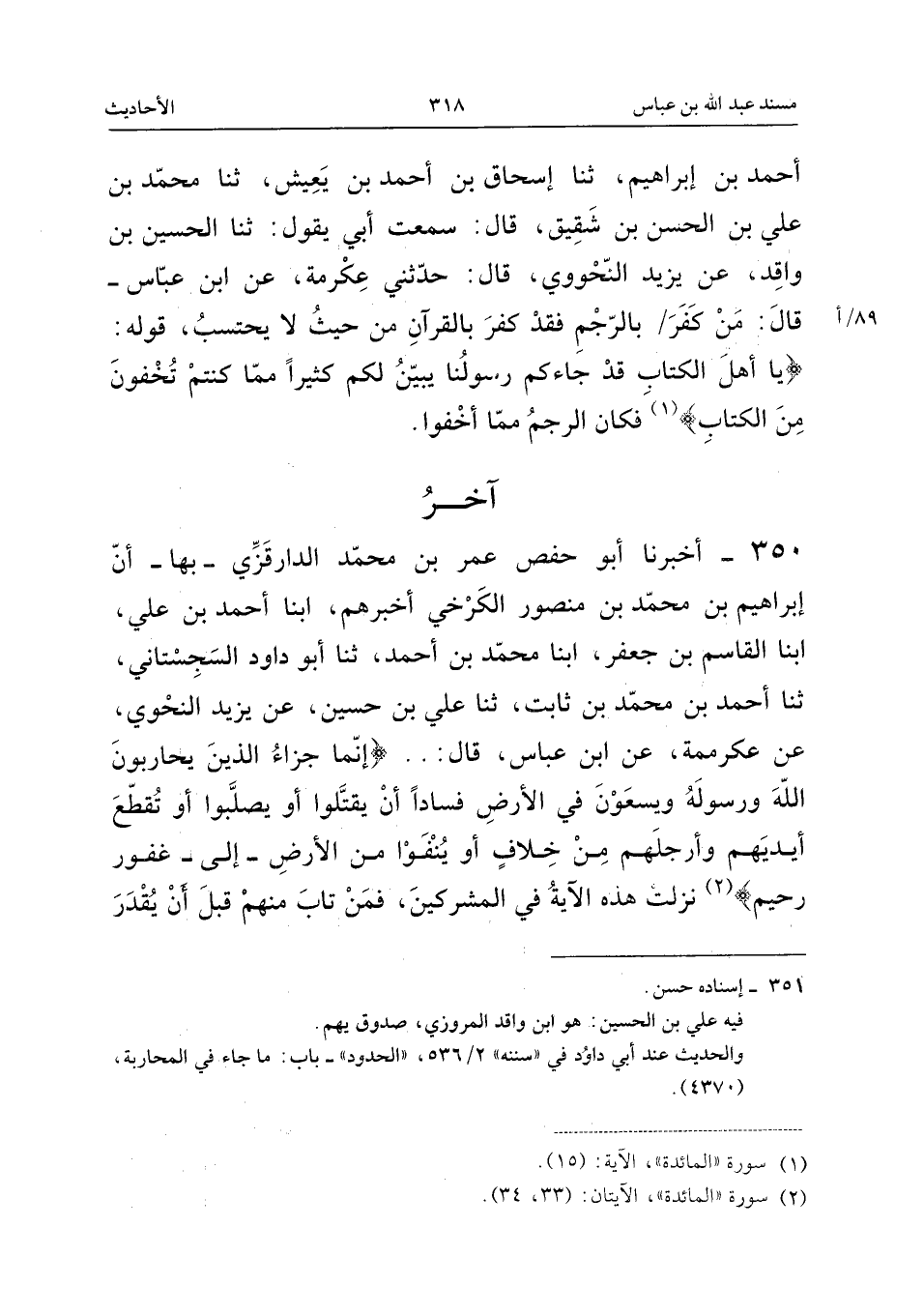 ٣٥٠ - أَخْبَرَنَا أَبُو حَفْصٍ عُمَرُ بْنُ مُحَمَّدٍ الدَّارَقَزِّيُّ - بِهَا - أَنَّ إِبْرَاهِيمَ بْنَ مُحَمَّدِ بْنِ مَنْصُورٍ الْكَرْخِيَّ أَخْبَرَهُمْ، أَبْنَا أَحْمَدُ بْنُ عَلِيٍّ، أَبْنَا الْقَاسِمُ بْنُ جَعْفَرٍ، أَبْنَا مُحَمَّدُ بْنُ أَحْمَدَ، ثَنَا أَبُو دَاوُدَ السِّجِسْتَانِيُّ، ثَنَا أَحْمَدُ بْنُ مُحَمَّدِ بْنِ ثَابِتٍ، ثَنَا عَلِيُّ بْنُ حُسَيْنٍ، عَنْ يَزِيدَ النَّحْوِيِّ، عَنْ عِكْرِمَةَ، عَنِ ابْنِ عَبَّاسٍ، قَالَ: «{إِنَّمَا جَزَاءُ الَّذِينَ يُحَارِبُونَ اللهَ وَرَسُولَهُ وَيَسْعَوْنَ فِي الأَرْضِ فَسَادًا أَنْ يُقَتَّلُوا أَوْ يُصَلَّبُوا أَوْ تُقَطَّعَ أَيْدِيهِمْ وَأَرْجُلُهُمْ مِنْ خِلافٍ أَوْ يُنْفَوْا مِنَ الأَرْضِ} إِلَى - {غَفُورٌ رَحِيمٌ} نَزَلَتْ هَذِهِ الْآيَةُ فِي الْمُشْرِكِينَ، فَمَنْ تَابَ مِنْهُمْ قَبْلَ أَنْ يُقْدَرَ