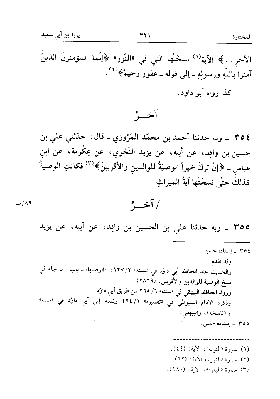 ٣٥٤ - وَبِهِ حَدَّثَنَا أَحْمَدُ بْنُ مُحَمَّدٍ الْمَرْوَزِيُّ، قَالَ: حَدَّثَنِي عَلِيُّ بْنُ حُسَيْنِ بْنِ وَاقِدٍ، عَنْ أَبِيهِ، عَنْ يَزِيدَ النَّحْوِيِّ، عَنْ عِكْرِمَةَ، عَنِ ابْنِ عَبَّاسٍ - «{إِنْ تَرَكَ خَيْرًا الْوَصِيَّةُ لِلْوَالِدَيْنِ وَالأَقْرَبِينَ} فَكَانَتِ الْوَصِيَّةُ كَذَلِكَ حَتَّى نَسَخَتْهَا آيَةُ الْمِيرَاثِ».