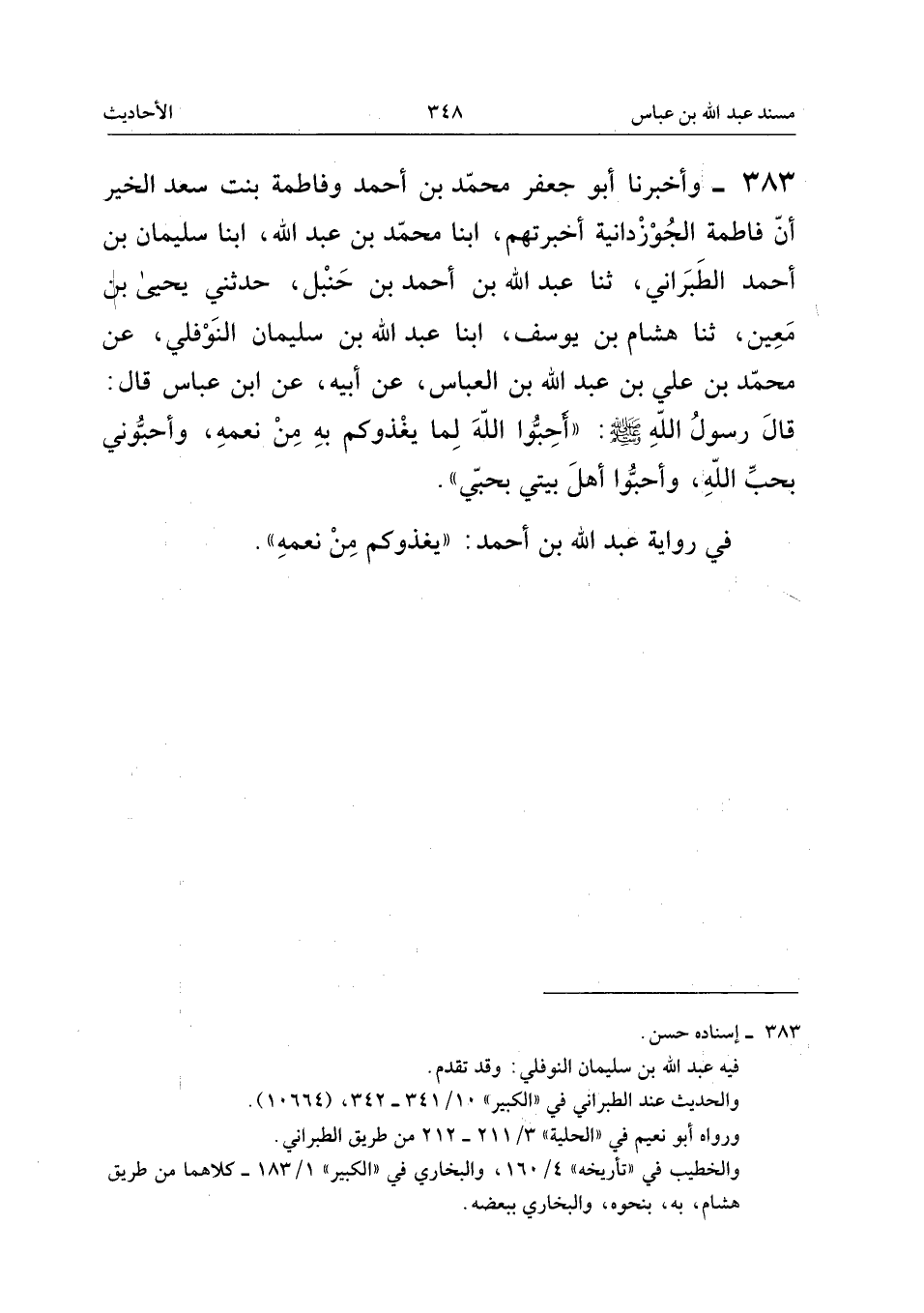 ٣٨٣ - وَأَخْبَرَنَا أَبُو جَعْفَرٍ مُحَمَّدُ بْنُ أَحْمَدَ وَفَاطِمَةُ بِنْتُ سَعْدِ الْخَيْرِ أَنَّ فَاطِمَةَ الْجُوزْدَانِيَّةَ أَخْبَرَتْهُمْ، أَبْنَا مُحَمَّدُ بْنُ عَبْدِ اللهِ، أَبْنَا سُلَيْمَانُ بْنُ أَحْمَدَ الطَّبَرَانِيُّ، ثَنَا عَبْدُ اللهِ بْنُ أَحْمَدَ بْنِ حَنْبَلٍ، حَدَّثَنِي يَحْيَى بْنُ مَعِينٍ، ثَنَا هِشَامُ بْنُ يُوسُفَ، أَبْنَا عَبْدُ اللهِ بْنُ سُلَيْمَانَ النَّوْفَلِيُّ، عَنْ مُحَمَّدِ بْنِ عَلِيِّ بْنِ عَبْدِ اللهِ بْنِ الْعَبَّاسِ، عَنْ أَبِيهِ، عَنِ ابْنِ عَبَّاسٍ قَالَ: قَالَ رَسُولُ اللهِ صَلَّى اللهُ عَلَيْهِ وَسَلَّمَ: «أَحِبُّوا اللهَ لِمَا يَغْذُوكُمْ بِهِ مِنْ نِعَمِهِ، وَأَحِبُّونِي بِحُبِّ اللهِ، وَأَحِبُّوا أَهْلَ بَيْتِي بِحُبِّي.