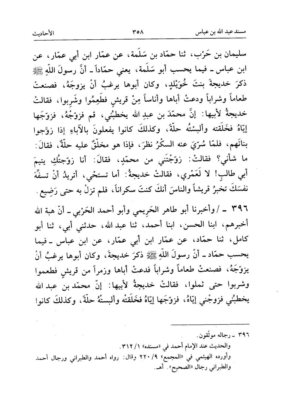 ٣٩٦ - وَأَخْبَرَنَا أَبُو طَاهِرٍ الْحَرِيمِيُّ وَأَبُو أَحْمَدَ (¬١) الْحَرْبِيُّ، أَنَّ هِبَةَ اللهِ أَخْبَرَهُمْ، أَبْنَا الْحَسَنُ، أَبْنَا أَحْمَدُ، ثَنَا عَبْدُ اللهِ، حَدَّثَنِي أَبِي، ثَنَا أَبُو كَامِلٍ، ثَنَا حَمَّادٌ، عَنْ عَمَّارِ ابْنِ أَبِي عَمَّارٍ، عَنِ ابْنِ عَبَّاسٍ - فِيمَا يَحْسَبُ حَمَّادٌ - «أَنَّ رَسُولَ اللهِ - صَلَّى اللهُ عَلَيْهِ وَسَلَّمَ - ذَكَرَ خَدِيجَةَ، وَكَانَ أَبُوهَا يَرْغَبُ أَنْ يُزَوِّجَهُ، فَصَنَعَتْ طَعَامًا وَشَرَابًا فَدَعَتْ أَبَاهَا وَزُمَرًا مِنْ قُرَيْشٍ فَطَعِمُوا وَشَرِبُوا حَتَّى ثَمِلُوا، فَقَالَتْ خَدِيجَةُ لِأَبِيهَا: إِنَّ مُحَمَّدَ بْنَ عَبْدِ اللهِ يَخْطُبُنِي فَزَوِّجْنِي إِيَّاهُ، فَزَوَّجَهَا إِيَّاهُ فَخَلَّقَتْهُ وَأَلْبَسَتْهُ حُلَّةً، وَكَذَلِكَ كَانُوا