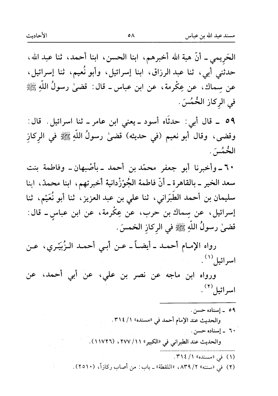 ٦٠ - وَأَخْبَرَنَا أَبُو جَعْفَرٍ مُحَمَّدُ بْنُ أَحْمَدَ - بِأَصْبَهَانَ - وَفَاطِمَةُ بِنْتُ سَعْدِ الْخَيْرِ - بِالْقَاهِرَةِ - أَنَّ فَاطِمَةَ الْجُوزْدَانِيَّةَ أَخْبَرَتْهُمْ، أَبْنَا مُحَمَّدٌ، أَبْنَا سُلَيْمَانُ بْنُ أَحْمَدَ الطَّبَرَانِيُّ، ثَنَا عَلِيُّ بْنُ عَبْدِ الْعَزِيزِ، ثَنَا أَبُو نُعَيْمٍ، ثَنَا إِسْرَائِيلُ، عَنْ سِمَاكِ بْنِ حَرْبٍ، عَنْ عِكْرِمَةَ، عَنِ ابْنِ عَبَّاسٍ، قَالَ: «قَضَى رَسُولُ اللهِ - صَلَّى اللهُ عَلَيْهِ وَسَلَّمَ - فِي الرِّكَازِ الْخُمُسَ».
