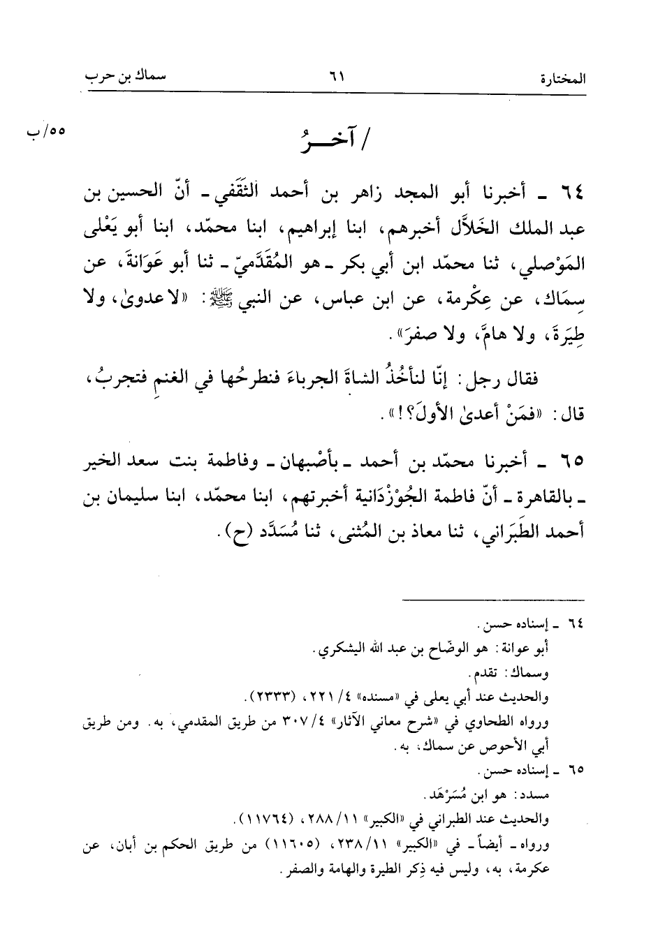 ٦٤ - أَخْبَرَنَا أَبُو الْمَجْدِ زَاهِرُ بْنُ أَحْمَدَ الثَّقَفِيُّ، أَنَّ الْحُسَيْنَ بْنَ عَبْدِ الْمَلِكِ الْخَلَّالَ أَخْبَرَهُمْ، أَبْنَا إِبْرَاهِيمُ، أَبْنَا مُحَمَّدٌ، أَبْنَا أَبُو يَعْلَى الْمَوْصِلِيُّ، ثَنَا مُحَمَّدُ ابْنُ أَبِي بَكْرٍ - هُوَ الْمُقَدَّمِيُّ - ثَنَا أَبُو عَوَانَةَ، عَنْ سِمَاكٍ، عَنْ عِكْرِمَةَ، عَنِ ابْنِ عَبَّاسٍ، عَنِ النَّبِيِّ - صَلَّى اللهُ عَلَيْهِ وَسَلَّمَ -: «لَا عَدْوَى، وَلَا طِيرَةَ، وَلَا هَامَ، وَلَا صَفَرَ.