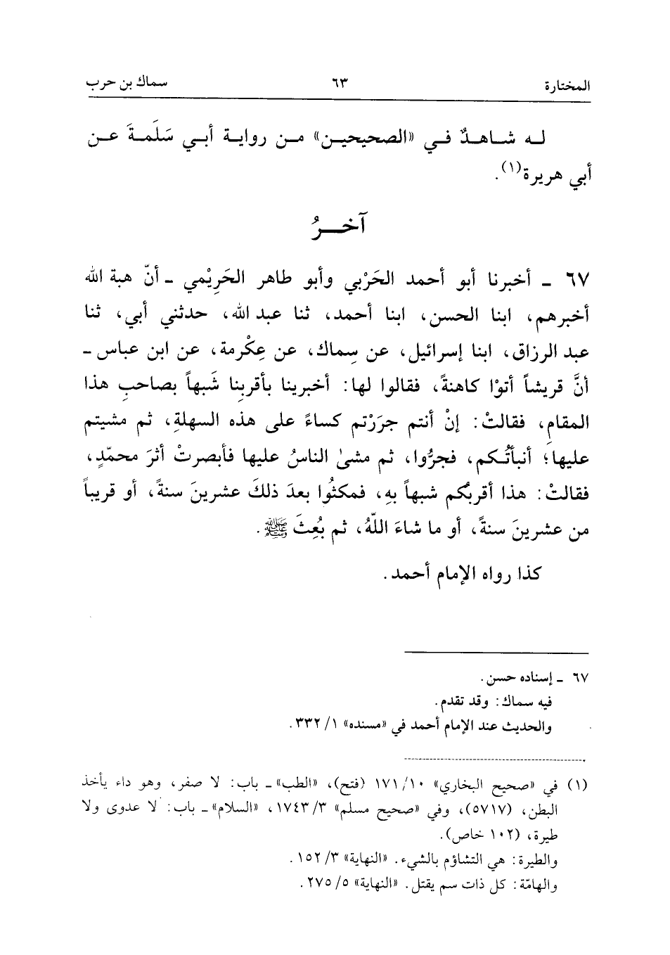 ٦٧ - أَخْبَرَنَا أَبُو أَحْمَدَ الْحَرْبِيُّ (¬١) وَأَبُو طَاهِرٍ الْحَرِيمِيُّ، أَنَّ هِبَةَ اللهِ أَخْبَرَهُمْ، أَبْنَا الْحَسَنُ، أَبْنَا أَحْمَدُ، ثَنَا عَبْدُ اللهِ، حَدَّثَنِي أَبِي، ثَنَا عَبْدُ الرَّزَّاقِ، أَبْنَا إِسْرَائِيلُ، عَنْ سِمَاكٍ، عَنْ عِكْرِمَةَ، عَنِ ابْنِ عَبَّاسٍ: «أَنَّ قُرَيْشًا أَتَوْا كَاهِنَةً، فَقَالُوا لَهَا: أَخْبِرِينَا بِأَقْرَبِنَا شَبَهًا بِصَاحِبِ هَذَا الْمَقَامِ، فَقَالَتْ: إِنْ أَنْتُمْ جَرَرْتُمْ كِسَاءً عَلَى هَذِهِ السِّهْلَةِ، ثُمَّ مَشَيْتُمْ عَلَيْهَا؛ أَنْبَأْتُكُمْ، فَجَرُّوا، ثُمَّ مَشَى النَّاسُ عَلَيْهَا فَأَبْصَرَتْ أَثَرَ مُحَمَّدٍ، فَقَالَتْ: هَذَا أَقْرَبُكُمْ شَبَهًا بِهِ، فَمَكَثُوا بَعْدَ ذَلِكَ عِشْرِينَ سَنَةً، أَوْ قَرِيبًا مِنْ عِشْرِينَ سَنَةً، أَوْ مَا شَاءَ اللهُ، ثُمَّ بُعِثَ صَلَّى اللهُ عَلَيْهِ وَسَلَّمَ».