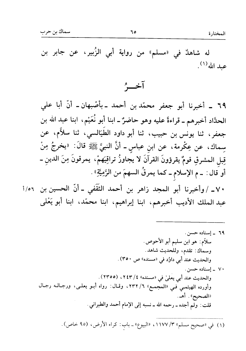 ٦٩ - أَخْبَرَنَا أَبُو جَعْفَرٍ مُحَمَّدُ بْنُ أَحْمَدَ - بِأَصْبَهَانَ - أَنَّ أَبَا عَلِيٍّ الْحَدَّادَ أَخْبَرَهُمْ، قِرَاءَةً عَلَيْهِ وَهُوَ حَاضِرٌ، أَبْنَا أَبُو نُعَيْمٍ، أَبْنَا عَبْدُ اللهِ بْنُ جَعْفَرٍ، ثَنَا يُونُسُ بْنُ حَبِيبٍ، ثَنَا أَبُو دَاوُدَ الطَّيَالِسِيُّ، ثَنَا سَلَّامُ، عَنْ سِمَاكٍ، عَنْ عِكْرِمَةَ، عَنِ ابْنِ عَبَّاسٍ: أَنَّ النَّبِيَّ - صَلَّى اللهُ عَلَيْهِ وَسَلَّمَ - قَالَ: «يَخْرُجُ مِنْ قِبَلِ الْمَشْرِقِ قَوْمٌ يَقْرَؤُونَ الْقُرْآنَ لَا يُجَاوِزُ تَرَاقِيَهُمْ، يَمْرُقُونَ مِنَ الدِّينِ - أَوْ قَالَ: مِنَ الْإِسْلَامِ - كَمَا يَمْرُقُ السَّهْمُ مِنَ الرَّمِيَّةِ».