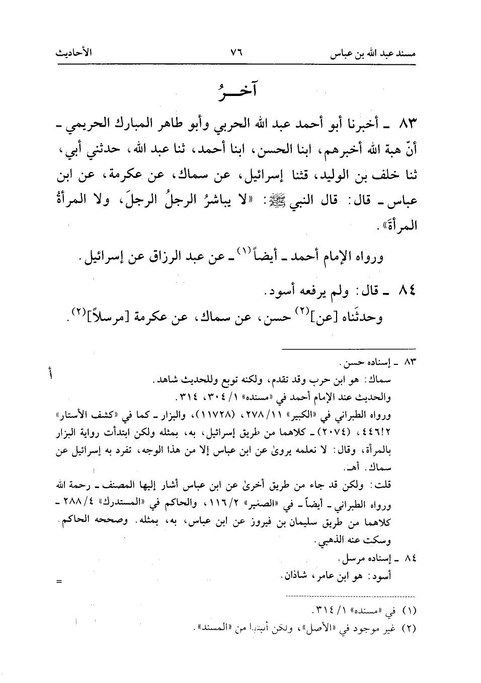 ٨٣ - أَخْبَرَنَا أَبُو أَحْمَدَ عَبْدُ اللهِ الْحَرْبِيُّ (¬١) وَأَبُو طَاهِرٍ الْمُبَارَكُ الْحَرِيمِيُّ - أَنَّ هِبَةَ اللهِ أَخْبَرَهُمْ، أَبْنَا الْحَسَنُ، أَبْنَا أَحْمَدُ، ثَنَا عَبْدُ اللهِ، حَدَّثَنِي أَبِي، ثَنَا خَلَفُ بْنُ الْوَلِيدِ، قَثَنَا إِسْرَائِيلُ، عَنْ سِمَاكٍ، عَنْ عِكْرِمَةَ، عَنِ ابْنِ عَبَّاسٍ، قَالَ: قَالَ النَّبِيُّ صَلَّى اللهُ عَلَيْهِ وَسَلَّمَ: «لَا يُبَاشِرِ الرَّجُلُ الرَّجُلَ، وَلَا الْمَرْأَةُ الْمَرْأَةَ».