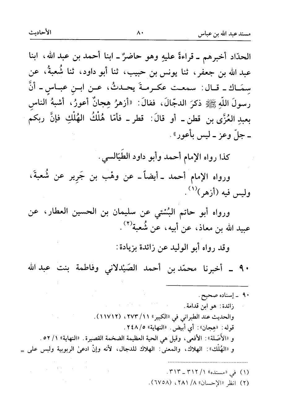 أَخْبَرَتْهُمْ، أَبْنَا مُحَمَّدُ بْنُ رِيذَةَ، أَبْنَا سُلَيْمَانُ بْنُ أَحْمَدَ الطَّبَرَانِيُّ، ثَنَا مُحَمَّدُ بْنُ مُحَمَّدٍ التَّمَّارُ وَأَبُو خَلِيفَةَ، قَالَا: ثَنَا أَبُو الْوَلِيدِ الطَّيَالِسِيُّ، ثَنَا زَائِدَةُ، ثَنَا سِمَاكُ بْنُ حَرْبٍ، عَنْ عِكْرِمَةَ، عَنِ ابْنِ عَبَّاسٍ، قَالَ: قَالَ رَسُولُ اللهِ صَلَّى اللهُ عَلَيْهِ وَسَلَّمَ: «الدَّجَّالُ جَعْدٌ هِجَانٌ أَقْمَرُ، كَأَنَّ رَأْسَهُ غُصْنُ شَجَرَةٍ، مَطْمُوسٌ عَيْنُهُ الْيُسْرَى، وَالْأُخْرَى كَأَنَّهَا عِنَبَةٌ طَافِيَةٌ، أَشْبَهُ النَّاسِ بِهِ عَبْدُ الْعُزَّى بْنُ قَطَنٍ، فَأَمَّا هَلَكَ الْهُلَّكُ فَإِنَّهُ أَعْوَرُ؛ وَإِنَّ رَبَّكُمْ لَيْسَ بِأَعْوَرَ».