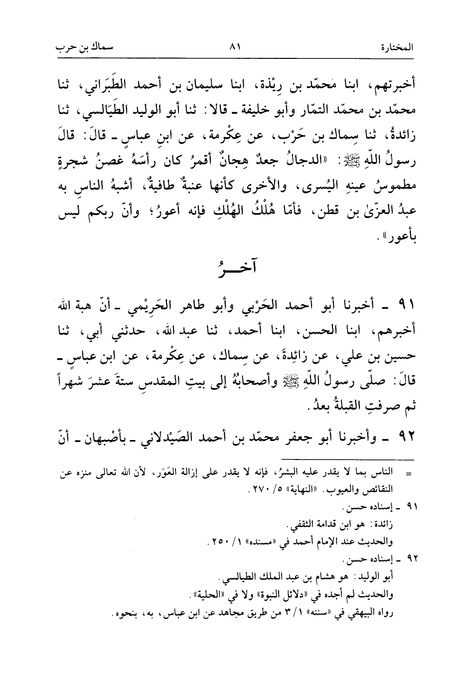 أَبَا عَلِيٍّ الْحَسَنَ بْنَ أَحْمَدَ الْحَدَّادَ أَخْبَرَهُمْ - وَهُوَ حَاضِرٌ - أَبْنَا أَبُو نُعَيْمٍ أَحْمَدُ بْنُ عَبْدِ اللهِ، أَبْنَا عَبْدُ اللهِ بْنُ جَعْفَرٍ، أَبْنَا إِسْمَاعِيلُ بْنُ عَبْدِ اللهِ سَمُّويَهْ، ثَنَا أَبُو الْوَلِيدِ، ثَنَا زَائِدَةُ، عَنْ سِمَاكٍ، عَنْ عِكْرِمَةَ، عَنِ ابْنِ عَبَّاسٍ: «أَنَّ رَسُولَ اللهِ - صَلَّى اللهُ عَلَيْهِ وَسَلَّمَ - صَلَّى هُوَ وَأَصْحَابُهُ نَحْوَ بَيْتِ الْمَقْدِسِ سِتَّةَ عَشَرَ شَهْرًا ثُمَّ حُوِّلَتِ الْقِبْلَةُ بَعْدُ».