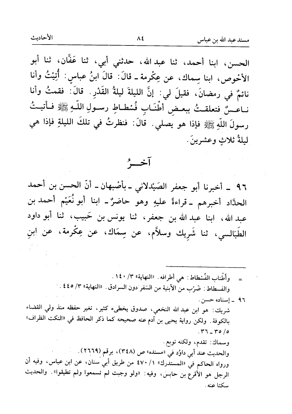 ٩٦ - أَخْبَرَنَا أَبُو جَعْفَرٍ الصَّيْدَلَانِيُّ - بِأَصْبَهَانَ - أَنَّ الْحَسَنَ بْنَ أَحْمَدَ الْحَدَّادَ أَخْبَرَهُمْ - قِرَاءَةً عَلَيْهِ وَهُوَ حَاضِرٌ - أَبْنَا أَبُو نُعَيْمٍ أَحْمَدُ بْنُ عَبْدِ اللهِ، أَبْنَا عَبْدُ اللهِ بْنُ جَعْفَرٍ، ثَنَا يُونُسُ بْنُ حَبِيبٍ، ثَنَا أَبُو دَاوُدَ الطَّيَالِسِيُّ، ثَنَا شَرِيكٌ وَسَلَامٌ، عَنْ سِمَاكٍ، عَنْ عِكْرِمَةَ، عَنِ ابْنِ