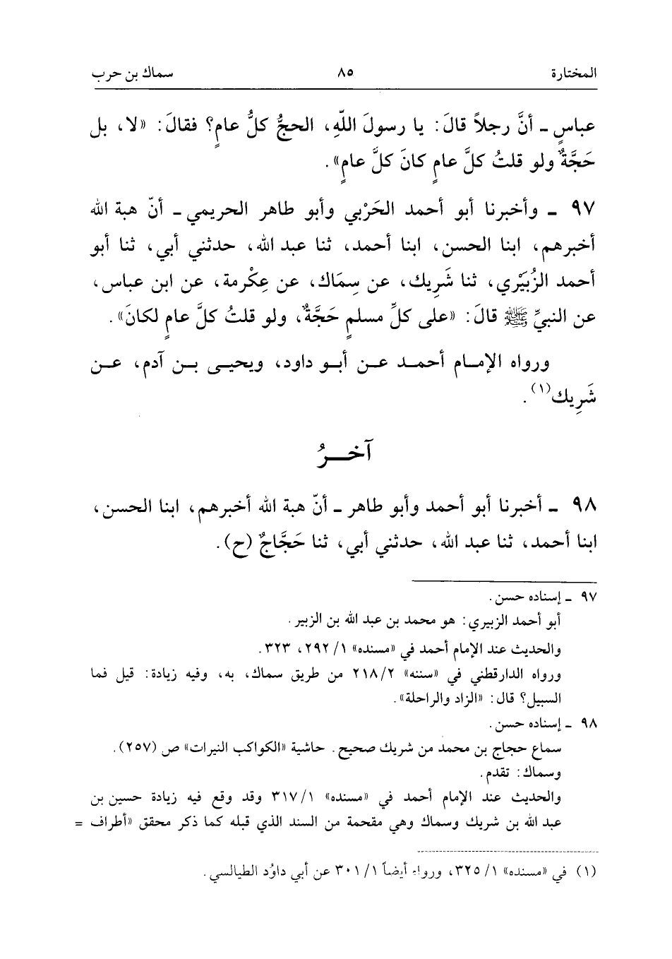 ٩٧ - وَأَخْبَرَنَا أَبُو أَحْمَدَ الْحَرْبِيُّ (¬١) وَأَبُو طَاهِرٍ الْحَرِيمِيُّ، أَنَّ هِبَةَ اللهِ أَخْبَرَهُمْ، أَبْنَا الْحَسَنُ، أَبْنَا أَحْمَدُ، ثَنَا عَبْدُ اللهِ، حَدَّثَنِي أَبِي، ثَنَا أَبُو أَحْمَدَ الزُّبَيْرِيُّ، ثَنَا شَرِيكٌ، عَنْ سِمَاكٍ، عَنْ عِكْرِمَةَ، عَنِ ابْنِ عَبَّاسٍ، عَنِ النَّبِيِّ - صَلَّى اللهُ عَلَيْهِ وَسَلَّمَ، قَالَ: «عَلَى كُلِّ مُسْلِمٍ حَجَّةٌ، وَلَوْ قُلْتُ كُلَّ عَامٍ لَكَانَ».