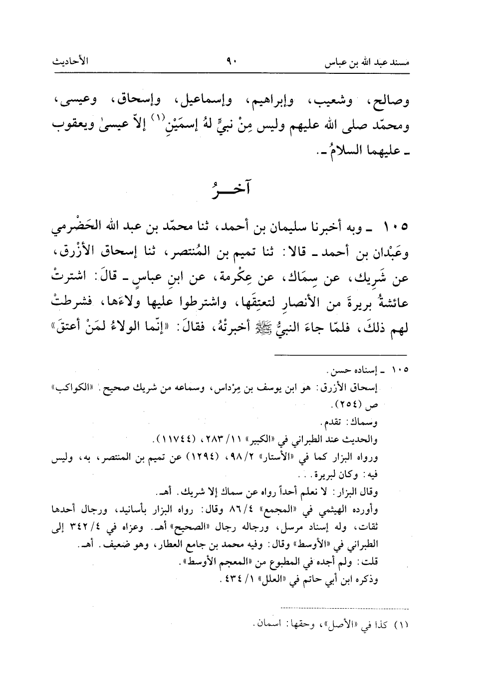 ١٠٥ - وَبِهِ أَخْبَرَنَا سُلَيْمَانُ بْنُ أَحْمَدَ، ثَنَا مُحَمَّدُ بْنُ عَبْدِ اللهِ الْحَضْرَمِيُّ وَعَبْدَانُ بْنُ أَحْمَدَ، قَالَا: ثَنَا تَمِيمُ بْنُ الْمُنْتَصِرِ، ثَنَا إِسْحَاقُ الْأَزْرَقُ، عَنْ شَرِيكٍ، عَنْ سِمَاكٍ، عَنْ عِكْرِمَةَ، عَنِ ابْنِ عَبَّاسٍ، قَالَ: «اشْتَرَتْ عَائِشَةُ بَرِيرَةَ مِنَ الْأَنْصَارِ لِتُعْتِقَهَا، وَاشْتَرَطُوا عَلَيْهَا وَلَاءَهَا، فَشَرَطَتْ لَهُمْ ذَلِكَ، فَلَمَّا جَاءَ النَّبِيُّ - صَلَّى اللهُ عَلَيْهِ وَسَلَّمَ - أَخْبَرَتْهُ، فَقَالَ: إِنَّمَا الْوَلَاءُ لِمَنْ أَعْتَقَ