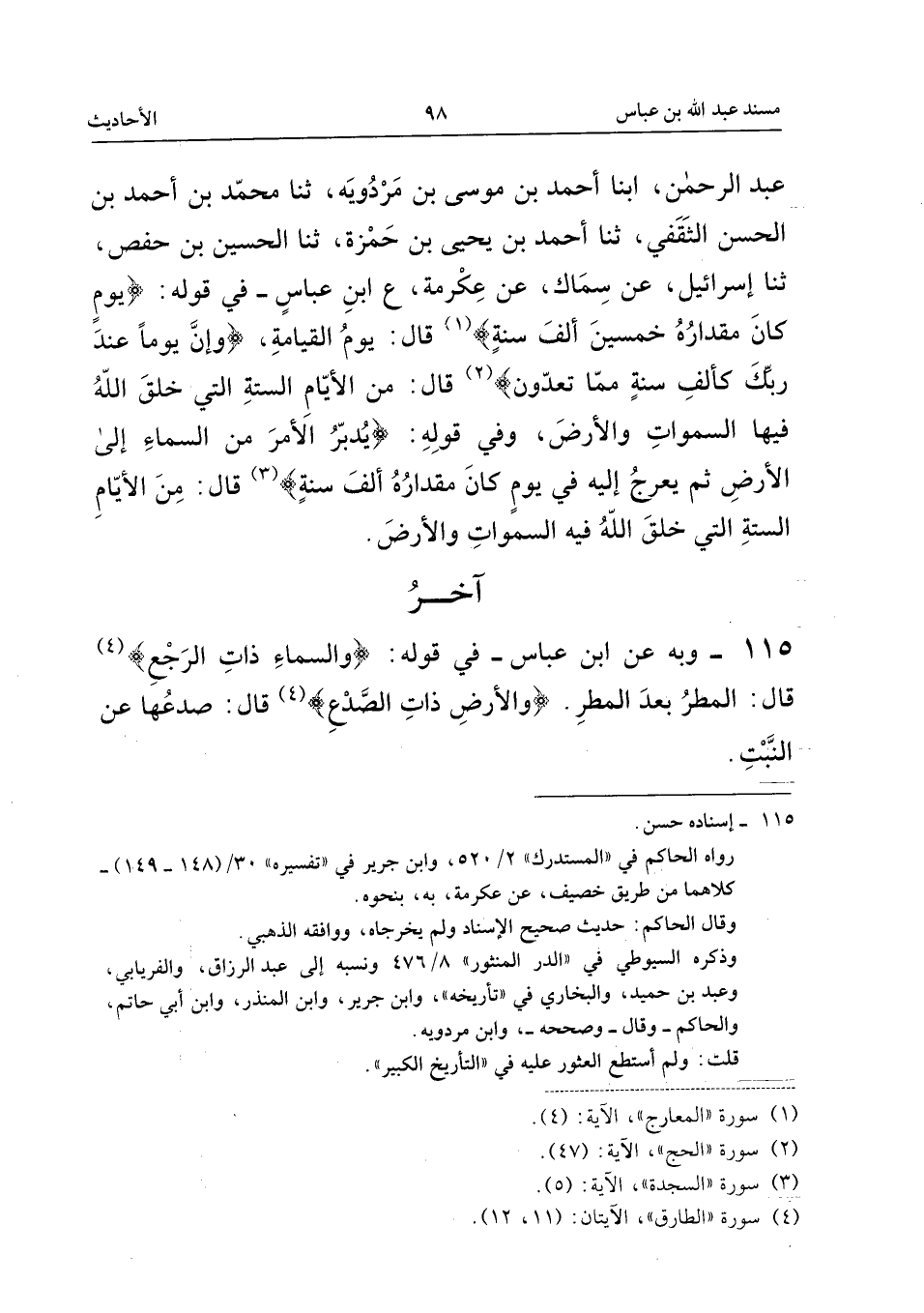 ١١٥ - وَبِهِ عَنِ ابْنِ عَبَّاسٍ - «فِي قَوْلِهِ {وَالسَّمَاءِ ذَاتِ الرَّجْعِ}. قَالَ: الْمَطَرُ بَعْدَ الْمَطَرِ. {وَالأَرْضِ ذَاتِ الصَّدْعِ}. قَالَ: صَدْعُهَا عَنِ النَّبْتِ».