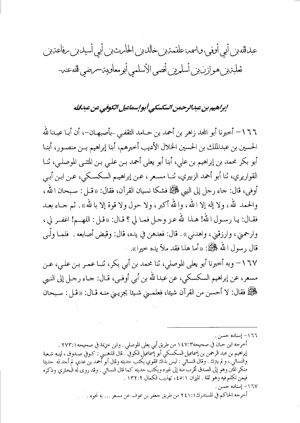 ١٦٦ - أَخْبَرَنَا أَبُو الْمَجْدِ زَاهِرُ بْنُ أَحْمَدَ بْنِ حَامِدٍ الثَّقَفِيُّ - بِأَصْبَهَانَ - أَنَّ أَبَا عَبْدِ اللهِ الْحُسَيْنَ بْنَ عَبْدِ الْمَلِكِ بْنِ الْحُسَيْنِ الْخَلَّالَ الْأَدِيبَ أَخْبَرَهُمْ، أَبْنَا إِبْرَاهِيمُ بْنُ مَنْصُورٍ، أَبْنَا أَبُو بَكْرٍ مُحَمَّدُ بْنُ إِبْرَاهِيمَ بْنِ عَلِيٍّ، أَبْنَا أَبُو يَعْلَى أَحْمَدُ بْنُ عَلِيِّ بْنِ الْمُثَنَّى الْمَوْصِلِيُّ، ثَنَا الْقَوَارِيرِيُّ، ثَنَا أَبُو أَحْمَدَ الزُّبَيْرِيُّ، ثَنَا مِسْعَرٌ، عَنْ إِبْرَاهِيمَ السَّكْسَكِيِّ، عَنِ ابْنِ أَبِي أَوْفَى، قَالَ: «جَاءَ رَجُلٌ إِلَى النَّبِيِّ صَلَّى اللهُ عَلَيْهِ وَسَلَّمَ فَشَكَا نِسْيَانَ الْقُرْآنِ، فَقَالَ: قُلْ: سُبْحَانَ اللهِ، وَالْحَمْدُ لِلهِ، وَلَا إِلَهَ إِلَّا اللهُ، وَاللهُ أَكْبَرُ، وَلَا حَوْلَ وَلَا قُوَّةَ إِلَّا بِاللهِ. ثُمَّ جَاءَ بَعْدُ فَقَالَ: يَا رَسُولَ اللهِ! هَذَا لِلهِ عَزَّ وَجَلَّ فَمَا لِي؟ قَالَ: قُلِ: اللَّهُمَّ اغْفِرْ لِي، وَارْحَمْنِي، وَارْزُقْنِي، وَاهْدِنِي قَالَ: فَعَدَّهُنَّ فِي يَدِهِ، قَالَ: وَقَبَضَ أَصَابِعَهُ. فَلَمَّا وَلَّى قَالَ رَسُولُ اللهِ صَلَّى اللهُ عَلَيْهِ وَسَلَّمَ: أَمَّا هَذَا فَقَدْ مَلَأَ يَدَهُ خَيْرًا».