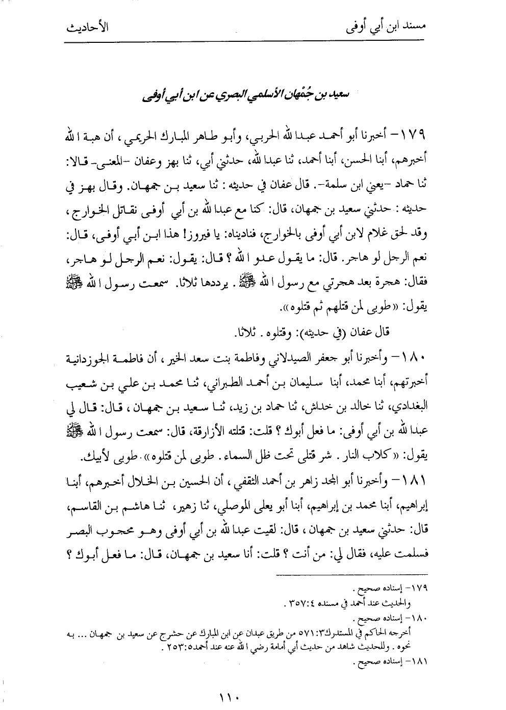 ١٧٩ - أَخْبَرَنَا أَبُو أَحْمَدَ عَبْدُ اللهِ الْحَرْبِيُّ (¬١)، وَأَبُو طَاهِرٍ الْمُبَارَكُ الْحَرِيمِيُّ، أَنَّ هِبَةَ اللهِ أَخْبَرَهُمْ، أَبْنَا الْحَسَنُ، أَبْنَا أَحْمَدُ، ثَنَا عَبْدُ اللهِ، حَدَّثَنِي أَبِي، ثَنَا بَهْزٌ وَعَفَّانُ - الْمَعْنَى - قَالَا: ثَنَا حَمَّادٌ - يَعْنِي ابْنَ سَلَمَةَ -. قَالَ عَفَّانُ فِي حَدِيثِهِ: ثَنَا سَعِيدُ بْنُ جُمْهَانَ، وَقَالَ بَهْزٌ فِي حَدِيثِهِ: حَدَّثَنِي سَعِيدُ بْنُ جُمْهَانَ، قَالَ: «كُنَّا مَعَ عَبْدِ اللهِ بْنِ أَبِي أَوْفَى نُقَاتِلُ الْخَوَارِجَ، وَقَدْ لَحِقَ غُلَامٌ لِابْنِ أَبِي أَوْفَى بِالْخَوَارِجِ، فَنَادَيْنَاهُ: يَا فَيْرُوزُ! هَذَا ابْنُ أَبِي أَوْفَى، قَالَ: نِعْمَ الرَّجُلُ لَوْ هَاجَرَ. قَالَ: مَا يَقُولُ عَدُوُّ اللهِ؟ قَالَ: يَقُولُ: نِعْمَ الرَّجُلُ لَوْ هَاجَرَ، فَقَالَ: هِجْرَةٌ بَعْدَ هِجْرَتِي مَعَ رَسُولِ اللهِ صَلَّى اللهُ عَلَيْهِ وَسَلَّمَ، يُرَدِّدُهَا ثَلَاثًا، سَمِعْتُ رَسُولَ اللهِ صَلَّى اللهُ عَلَيْهِ وَسَلَّمَ يَقُولُ: طُوبَى لِمَنْ قَتَلَهُمْ ثُمَّ قَتَلُوهُ».