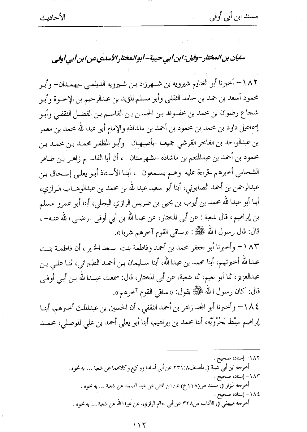 ١٨٢ - أَخْبَرَنَا أَبُو الْغَنَايِمِ شِيرَوَيْهِ بْنُ شَهْرَزَادَ بْنِ شِيرَوَيْهِ الدَّيْلَمِيُّ - بِهَمْدَانَ - وَأَبُو مَحْمُودٍ أَسْعَدُ بْنُ حَمَدِ بْنِ حَامِدٍ الثَّقَفِيُّ، وَأَبُو مُسْلِمٍ الْمُؤَيَّدُ بْنُ عَبْدِ الرَّحِيمِ بْنِ الْإِخْوَةِ وَأَبُو شُجَاعٍ رِضْوَانُ بْنُ مُحَمَّدِ بْنِ مَحْفُوظِ بْنِ الْحَسَنِ بْنِ الْقَاسِمِ بْنِ الْفَضْلِ الثَّقَفِيُّ وَأَبُو إِسْمَاعِيلَ دَاوُدُ بْنُ مُحَمَّدِ بْنِ مَحْمُودِ بْنِ أَحْمَدَ بْنِ مَاشَاذَهَ، وَالْإِمَامُ أَبُو عَبْدِ اللهِ مُحَمَّدُ بْنُ مَعْمَرِ بْنِ عَبْدِ الْوَاحِدِ بْنِ الْفَاخِرِ الْقُرَشِيُّ جَمِيعًا - بِأَصْبَهَانَ - وَأَبُو الْمُظَفَّرِ مُحَمَّدُ بْنُ مُحَمَّدِ بْنِ مَحْمُودِ بْنِ أَحْمَدَ بْنِ عَبْدِ الْمُنْعِمِ بْنِ مَاشَاذَهْ - بِشَهْرَسْتَانَ - أَنَّ أَبَا الْقَاسِمِ زَاهِرَ بْنَ طَاهِرٍ الشَّحَّامِيَّ أَخْبَرَهُمْ - قِرَاءَةً عَلَيْهِ وَهُمْ يَسْمَعُونَ - أَبْنَا الْأُسْتَاذُ أَبُو يَعْلَى إِسْحَاقُ بْنُ عَبْدِ الرَّحْمَنِ بْنِ أَحْمَدَ الصَّابُونِيُّ، أَبْنَا أَبُو سَعِيدٍ عَبْدُ اللهِ بْنُ مُحَمَّدِ بْنِ عَبْدِ الْوَهَّابِ الرَّازِيُّ، أَبْنَا أَبُو عَبْدِ اللهِ مُحَمَّدُ بْنُ أَيُّوبَ بْنِ يَحْيَى بْنِ ضُرَيْسٍ الرَّازِيُّ الْبَجَلِيُّ، أَبْنَا أَبُو عَمْرٍو مُسْلِمُ بْنُ إِبْرَاهِيمَ، قَالَ شُعْبَةُ: عَنْ أَبِي الْمُخْتَارِ، عَنْ عَبْدِ اللهِ بْنِ أَبِي أَوْفَى - رَضِيَ اللهُ عَنْهُ - قَالَ: قَالَ رَسُولُ اللهِ صَلَّى اللهُ عَلَيْهِ وَسَلَّمَ: «سَاقِي الْقَوْمِ آخِرُهُمْ شُرْبًا».