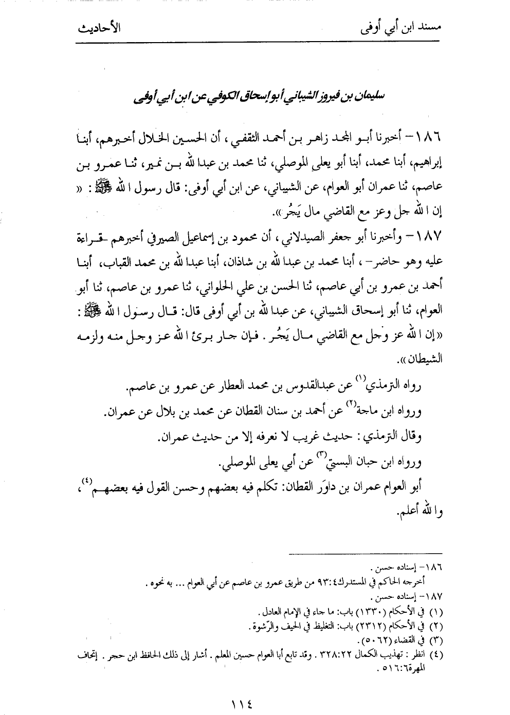 ١٨٦ - أَخْبَرَنَا أَبُو الْمَجْدِ زَاهِرُ بْنُ أَحْمَدَ الثَّقَفِيُّ، أَنَّ الْحُسَيْنَ الْخَلَّالَ أَخْبَرَهُمْ، أَبْنَا إِبْرَاهِيمُ، أَبْنَا مُحَمَّدٌ، أَبْنَا أَبُو يَعْلَى الْمَوْصِلِيُّ، ثَنَا مُحَمَّدُ بْنُ عَبْدِ اللهِ بْنِ نُمَيْرٍ، ثَنَا عَمْرُو بْنُ عَاصِمٍ، ثَنَا عِمْرَانُ أَبُو الْعَوَّامِ، عَنِ الشَّيْبَانِيِّ، عَنِ ابْنِ أَبِي أَوْفَى، قَالَ رَسُولُ اللهِ صَلَّى اللهُ عَلَيْهِ وَسَلَّمَ: «إِنَّ اللهَ جَلَّ وَعَزَّ مَعَ الْقَاضِي مَا لَمْ يَجُرْ».