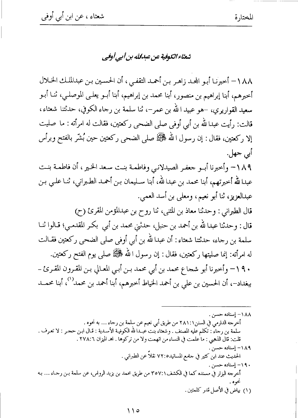 ١٨٨ - أَخْبَرَنَا أَبُو الْمَجْدِ زَاهِرُ بْنُ أَحْمَدَ الثَّقَفِيُّ، أَنَّ الْحُسَيْنَ بْنَ عَبْدِ الْمَلِكِ الْخَلَّالَ أَخْبَرَهُمْ، أَبْنَا إِبْرَاهِيمُ بْنُ مَنْصُورٍ، أَبْنَا مُحَمَّدُ بْنُ إِبْرَاهِيمَ، أَبْنَا أَبُو يَعْلَى الْمَوْصِلِيُّ، ثَنَا أَبُو سَعِيدٍ الْقَوَارِيرِيُّ، هُوَ عُبَيْدُ اللهِ بْنُ عُمَرَ - ثَنَا سَلَمَةُ بْنُ رَجَاءٍ الْكُوفِيُّ، حَدَّثَتْنَا شَعْثَاءُ، قَالَتْ: «رَأَيْتُ عَبْدَ اللهِ بْنَ أَبِي أَوْفَى صَلَّى الضُّحَى رَكْعَتَيْنِ، فَقَالَتْ لَهُ امْرَأَتُهُ: مَا صَلَّيْتَ إِلَّا رَكْعَتَيْنِ، فَقَالَ: إِنَّ رَسُولَ اللهِ صَلَّى اللهُ عَلَيْهِ وَسَلَّمَ صَلَّى الضُّحَى رَكْعَتَيْنِ حِينَ بُشِّرَ بِالْفَتْحِ وَبِرَأْسِ أَبِي جَهْلٍ».