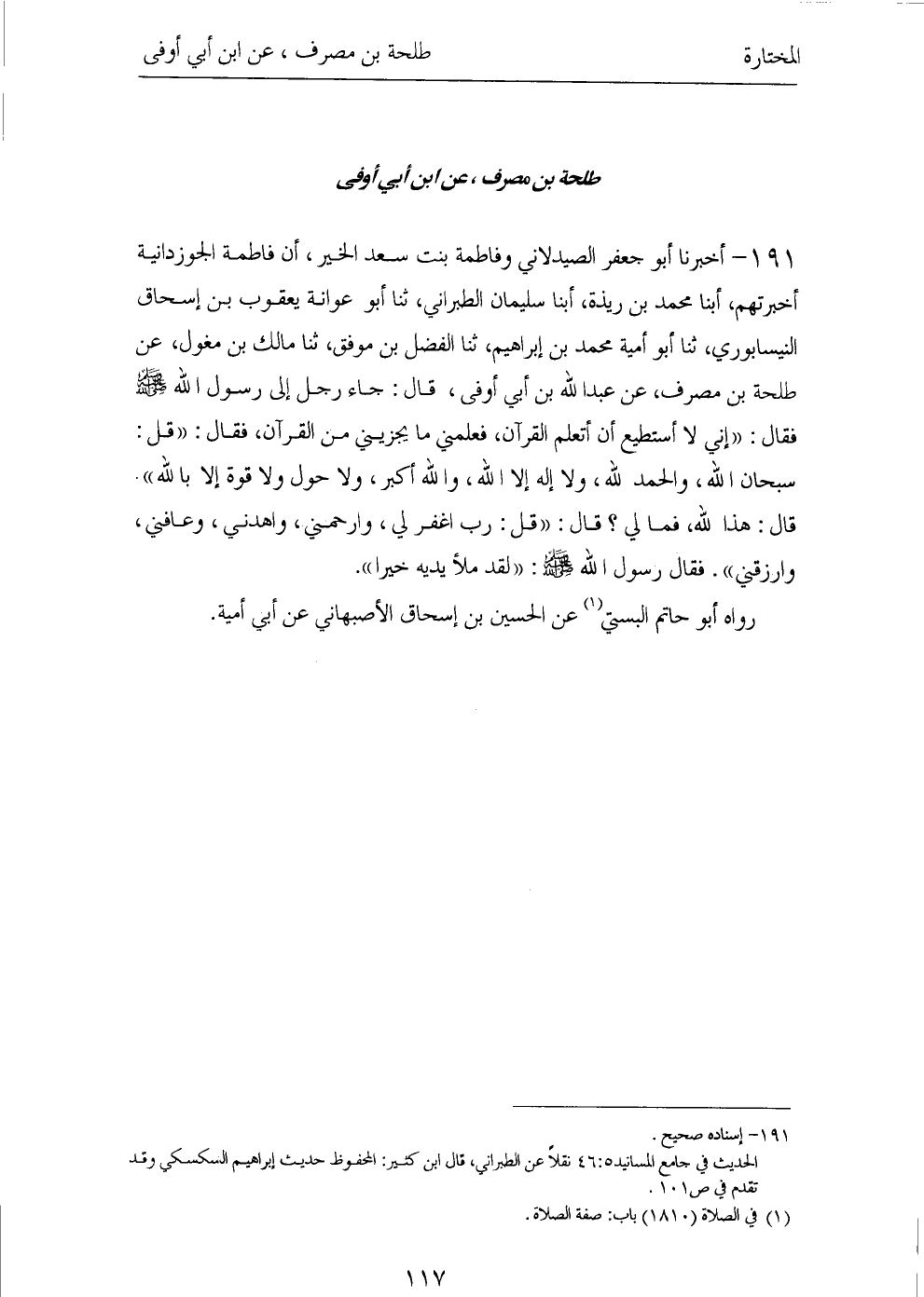 ١٩١ - أَخْبَرَنَا أَبُو جَعْفَرٍ الصَّيْدَلَانِيُّ وَفَاطِمَةُ بِنْتُ سَعْدِ الْخَيْرِ، أَنَّ فَاطِمَةَ الْجُوزْدَانِيَّةَ أَخْبَرَتْهُمْ، أَبْنَا مُحَمَّدُ بْنُ رِيذَةَ، أَبْنَا سُلَيْمَانُ الطَّبَرَانِيُّ، ثَنَا أَبُو عَوَانَةَ يَعْقُوبُ بْنُ إِسْحَاقَ النَّيْسَابُورِيُّ، ثَنَا أَبُو أُمَيَّةَ مُحَمَّدُ بْنُ إِبْرَاهِيمَ، ثَنَا الْفَضْلُ بْنُ مُوَفَّقٍ، ثَنَا مَالِكُ بْنُ مِغْوَلٍ، عَنْ طَلْحَةَ بْنِ مُصَرِّفٍ، عَنْ عَبْدِ اللهِ بْنِ أَبِي أَوْفَى، قَالَ: «جَاءَ رَجُلٌ إِلَى رَسُولِ اللهِ صَلَّى اللهُ عَلَيْهِ وَسَلَّمَ فَقَالَ: إِنِّي لَا أَسْتَطِيعُ أَنْ أَتَعَلَّمَ الْقُرْآنَ، فَعَلِّمْنِي مَا يَجْزِينِي مِنَ الْقُرْآنِ، فَقَالَ: قُلْ: سُبْحَانَ اللهِ وَالْحَمْدُ لِلهِ، وَلَا إِلَهَ إِلَّا اللهُ، وَاللهُ أَكْبَرُ، وَلَا حَوْلَ وَلَا قُوَّةَ إِلَّا بِاللهِ قَالَ: هَذَا لِلهِ، فَمَا لِي؟ قَالَ: قُلْ: رَبِّ اغْفِرْ لِي، وَارْحَمْنِي، وَاهْدِنِي، وَعَافِنِي، وَارْزُقْنِي. فَقَالَ رَسُولُ اللهِ صَلَّى اللهُ عَلَيْهِ وَسَلَّمَ: لَقَدْ مَلَأَ يَدَيْهِ خَيْرًا».