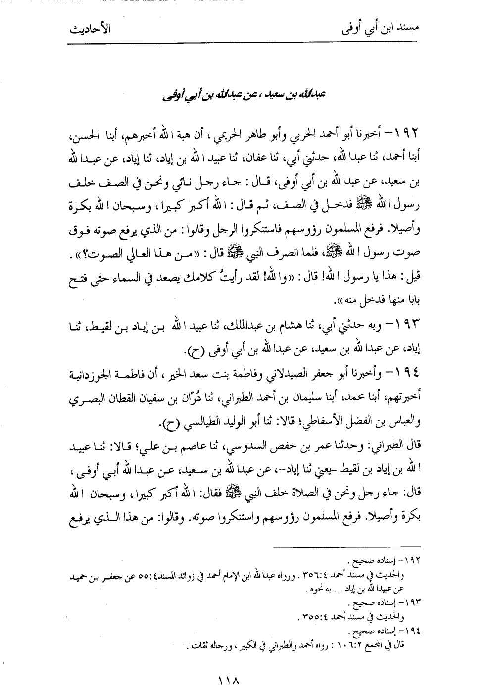 ١٩٢ - أَخْبَرَنَا أَبُو أَحْمَدَ الْحَرْبِيُّ (¬١) وَأَبُو طَاهِرٍ الْحَرِيمِيُّ، أَنَّ هِبَةَ اللهِ أَخْبَرَهُمْ، أَبْنَا الْحَسَنُ، أَبْنَا أَحْمَدُ، ثَنَا عَبْدُ اللهِ، حَدَّثَنِي أَبِي، ثَنَا عَفَّانُ، ثَنَا عُبَيْدُ اللهِ بْنُ إِيَادٍ، ثَنَا إِيَادٌ، عَنْ عَبْدِ اللهِ بْنِ سَعِيدٍ، عَنْ عَبْدِ اللهِ بْنِ أَبِي أَوْفَى، قَالَ: «جَاءَ رَجُلٌ نَاءٍ وَنَحْنُ فِي الصَّفِّ خَلْفَ رَسُولِ اللهِ صَلَّى اللهُ عَلَيْهِ وَسَلَّمَ فَدَخَلَ فِي الصَّفِّ، ثُمَّ قَالَ: اللهُ أَكْبَرُ كَبِيرًا، وَسُبْحَانَ اللهِ بُكْرَةً وَأَصِيلًا. فَرَفَعَ الْمُسْلِمُونَ رُؤُوسَهُمْ فَاسْتَنْكَرُوا الرَّجُلَ، وَقَالُوا: مَنِ الَّذِي يَرْفَعُ صَوْتَهُ فَوْقَ صَوْتِ رَسُولِ اللهِ صَلَّى اللهُ عَلَيْهِ وَسَلَّمَ، فَلَمَّا انْصَرَفَ النَّبِيُّ صَلَّى اللهُ عَلَيْهِ وَسَلَّمَ قَالَ: مَنْ هَذَا الْعَالِي الصَّوْتَ؟ قِيلَ: هَذَا يَا رَسُولَ اللهِ! قَالَ: وَاللهِ! لَقَدْ رَأَيْتُ كَلَامَكَ يَصْعَدُ إِلَى السَّمَاءِ حَتَّى فَتَحَ بَابًا مِنْهَا فَدَخَلَ مِنْهُ».