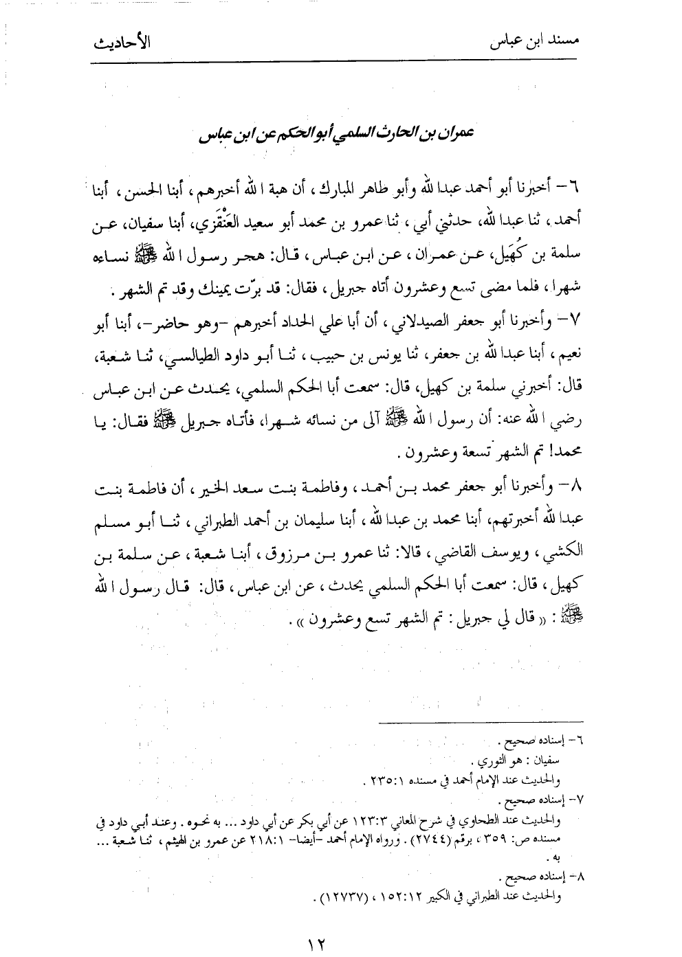 ٦ - أَخْبَرَنَا أَبُو أَحْمَدَ عَبْدُ اللهِ (¬١) وَأَبُو طَاهِرٍ الْمُبَارَكُ، أَنَّ هِبَةَ اللهِ أَخْبَرَهُمْ، أَبْنَا الْحَسَنُ، أَبْنَا أَحْمَدُ، ثَنَا عَبْدُ اللهِ، حَدَّثَنِي أَبِي، ثَنَا عَمْرُو بْنُ مُحَمَّدٍ أَبُو سَعِيدٍ الْعَنْقَزِيُّ، أَبْنَا سُفْيَانُ، عَنْ سَلَمَةَ بْنِ كُهَيْلٍ، عَنْ عِمْرَانَ، عَنِ ابْنِ عَبَّاسٍ، قَالَ: «هَجَرَ رَسُولُ اللهِ صَلَّى اللهُ عَلَيْهِ وَسَلَّمَ نِسَاءَهُ شَهْرًا، فَلَمَّا مَضَى تِسْعٌ وَعِشْرُونَ أَتَاهُ جِبْرِيلُ، فَقَالَ: قَدْ بَرَّتْ يَمِينُكَ وَقَدْ تَمَّ الشَّهْرُ».