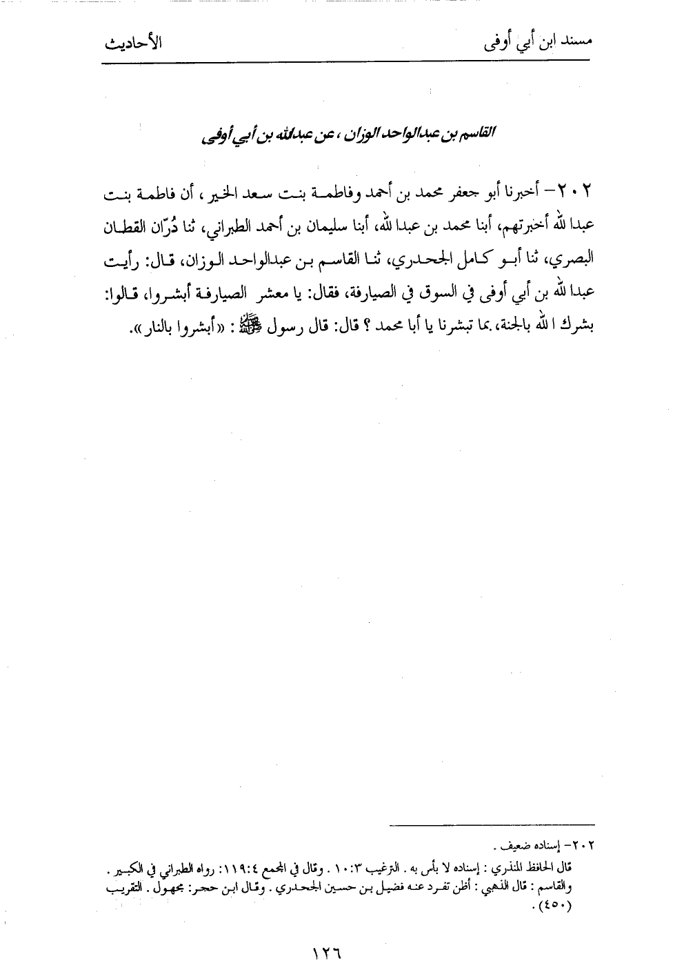 ٢٠٢ - أَخْبَرَنَا أَبُو جَعْفَرٍ مُحَمَّدُ بْنُ أَحْمَدَ، وَفَاطِمَةُ بِنْتُ سَعْدِ الْخَيْرِ، أَنَّ فَاطِمَةَ بِنْتَ عَبْدِ اللهِ أَخْبَرَتْهُمْ، أَبْنَا مُحَمَّدُ بْنُ عَبْدِ اللهِ، أَبْنَا سُلَيْمَانُ بْنُ أَحْمَدَ الطَّبَرَانِيُّ، ثَنَا دَرَّانُ الْقَطَّانُ الْبَصْرِيُّ، ثَنَا أَبُو كَامِلٍ الْجَحْدَرِيُّ، ثَنَا الْقَاسِمُ بْنُ عَبْدِ الْوَاحِدِ الْوَزَّانُ، قَالَ: «رَأَيْتُ عَبْدَ اللهِ بْنَ أَبِي أَوْفَى فِي السُّوقِ فِي الصَّيَارِفَةِ، فَقَالَ: يَا مَعْشَرَ الصَّيَارِفَةِ أَبْشِرُوا، قَالُوا: بَشَّرَكَ اللهُ بِالْجَنَّةِ، بِمَا تُبَشِّرُنَا يَا أَبَا مُحَمَّدٍ؟ قَالَ: قَالَ رَسُولُ اللهِ صَلَّى اللهُ عَلَيْهِ وَسَلَّمَ: أَبْشِرُوا بِالنَّارِ».