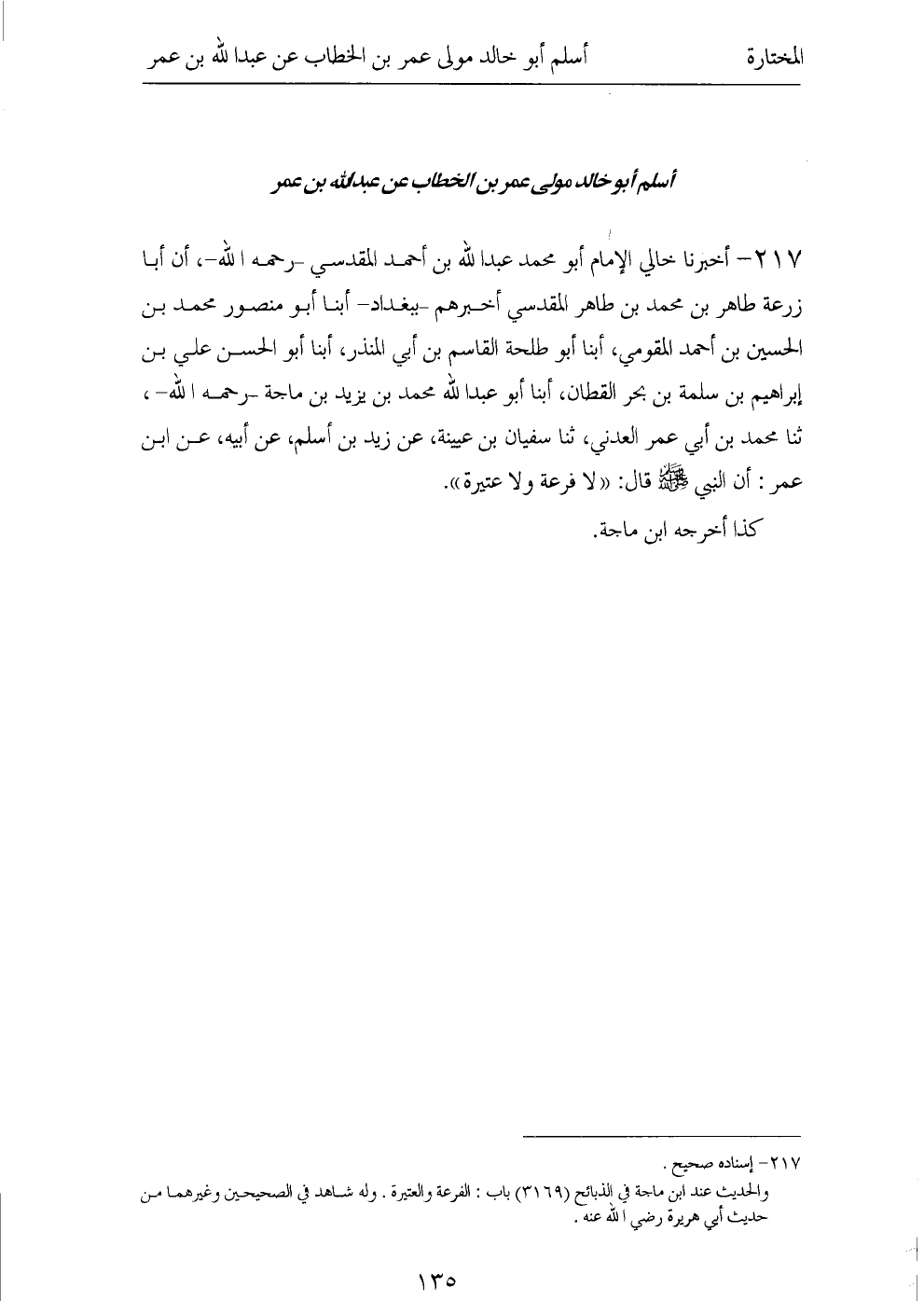 ٢١٧ - أَخْبَرَنَا خَالِي الْإِمَامُ أَبُو مُحَمَّدٍ عَبْدُ اللهِ بْنُ أَحْمَدَ الْمَقْدِسِيُّ - رَحِمَهُ اللهُ - أَنَّ أَبَا زُرْعَةَ طَاهِرَ بْنَ مُحَمَّدِ بْنِ طَاهِرٍ الْمَقْدِسِيَّ أَخْبَرَهُمْ - بِبَغْدَادَ - أَبْنَا أَبُو مَنْصُورٍ مُحَمَّدُ بْنُ الْحُسَيْنِ بْنِ أَحْمَدَ الْمُقَوِّمِيُّ، أَبْنَا أَبُو طَلْحَةَ الْقَاسِمُ بْنُ أَبِي الْمُنْذِرِ، أَبْنَا أَبُو الْحَسَنِ عَلِيُّ بْنُ إِبْرَاهِيمَ بْنِ سَلَمَةَ بْنِ بَحْرٍ الْقَطَّانُ، أَبْنَا أَبُو عَبْدِ اللهِ مُحَمَّدُ بْنُ يَزِيدَ بْنِ مَاجَهْ - رَحِمَهُ اللهُ - ثَنَا مُحَمَّدُ بْنُ أَبِي عُمَرَ الْعَدَنِيُّ، ثَنَا سُفْيَانُ بْنُ عُيَيْنَةَ، عَنْ زَيْدِ بْنِ أَسْلَمَ، عَنْ أَبِيهِ، عَنِ ابْنِ عُمَرَ، أَنَّ النَّبِيَّ صَلَّى اللهُ عَلَيْهِ وَسَلَّمَ قَالَ: «لَا فَرَعَةَ وَلَا عَتِيرَةَ».