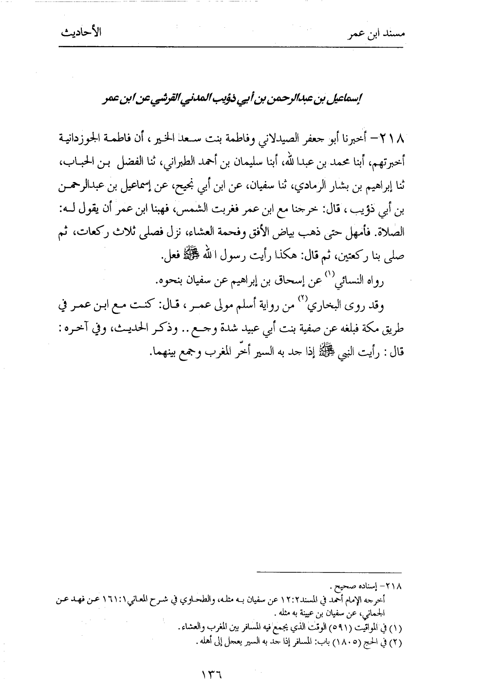 ٢١٨ - أَخْبَرَنَا أَبُو جَعْفَرٍ الصَّيْدَلَانِيُّ وَفَاطِمَةُ بِنْتُ سَعْدِ الْخَيْرِ، أَنَّ فَاطِمَةَ الْجُوزْدَانِيَّةَ أَخْبَرَتْهُمْ، أَبْنَا مُحَمَّدُ بْنُ عَبْدِ اللهِ، أَبْنَا سُلَيْمَانُ بْنُ أَحْمَدَ الطَّبَرَانِيُّ، ثَنَا الْفَضْلُ بْنُ الْحُبَابِ، ثَنَا إِبْرَاهِيمُ بْنُ بَشَّارٍ الرَّمَادِيُّ، ثَنَا سُفْيَانُ، عَنِ ابْنِ أَبِي نَجِيحٍ، عَنْ إِسْمَاعِيلَ بْنِ عَبْدِ الرَّحْمَنِ بْنِ أَبِي ذُؤَيْبٍ، قَالَ: «خَرَجْنَا مَعَ ابْنِ عُمَرَ فَغَرَبَتِ الشَّمْسُ، فَهِبْنَا ابْنَ عُمَرَ أَنْ يَقُولَ لَهُ: الصَّلَاةَ. فَأَمْهَلَ حَتَّى ذَهَبَ بَيَاضُ الْأُفُقِ وَفَحْمَةُ الْعِشَاءِ، نَزَلَ فَصَلَّى ثَلَاثَ رَكَعَاتٍ، ثُمَّ صَلَّى بِنَا رَكْعَتَيْنِ، ثُمَّ قَالَ: هَكَذَا رَأَيْتُ رَسُولَ اللهِ صَلَّى اللهُ عَلَيْهِ وَسَلَّمَ فَعَلَ».