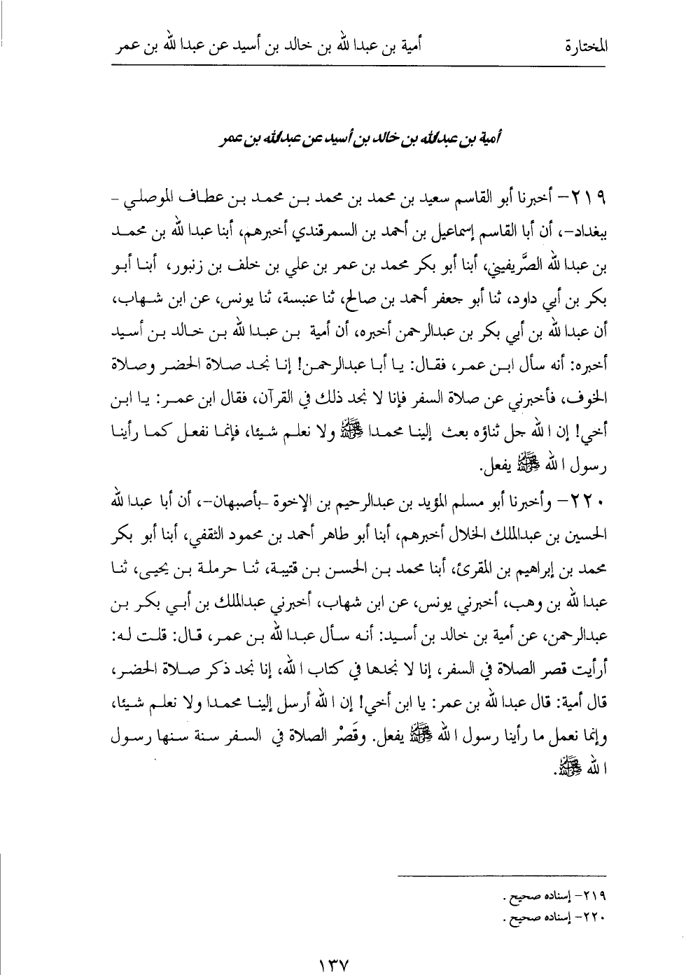 ٢١٩ - أَخْبَرَنَا أَبُو الْقَاسِمِ سَعِيدُ بْنُ مُحَمَّدِ بْنِ مُحَمَّدِ بْنِ مُحَمَّدِ بْنِ عَطَّافٍ الْمَوْصِلِيُّ - بِبَغْدَادَ - أَنَّ أَبَا الْقَاسِمِ إِسْمَاعِيلَ بْنَ أَحْمَدَ بْنِ السَّمَرْقَنْدِيِّ أَخْبَرَهُمْ، أَبْنَا عَبْدُ اللهِ بْنُ مُحَمَّدِ بْنِ عَبْدِ اللهِ الصَّرِيفِينِيُّ، أَبْنَا أَبُو بَكْرٍ مُحَمَّدُ بْنُ عُمَرَ بْنِ عَلِيِّ بْنِ خَلَفِ بْنِ زُنْبُورٍ، أَبْنَا أَبُو بَكْرِ بْنُ أَبِي دَاوُدَ، ثَنَا أَبُو جَعْفَرٍ أَحْمَدُ بْنُ صَالِحٍ، ثَنَا عَنْبَسَةُ، ثَنَا يُونُسُ، عَنِ ابْنِ شِهَابٍ، أَنَّ عَبْدَ اللهِ بْنَ أَبِي بَكْرِ بْنِ عَبْدِ الرَّحْمَنِ أَخْبَرَهُ، أَنَّ أُمَيَّةَ بْنَ عَبْدِ اللهِ بْنِ خَالِدِ بْنِ أَسِيدٍ أَخْبَرَهُ: أَنَّهُ «سَأَلَ ابْنَ عُمَرَ، فَقَالَ: يَا أَبَا عَبْدِ الرَّحْمَنِ! إِنَّا نَجِدُ صَلَاةَ الْحَضَرِ وَصَلَاةَ الْخَوْفِ، فَأَخْبِرْنِي عَنْ صَلَاةِ السَّفَرِ فَإِنَّا لَا نَجِدُ ذَلِكَ فِي الْقُرْآنِ، فَقَالَ ابْنُ عُمَرَ: يَا ابْنَ أَخِي! إِنَّ اللهَ جَلَّ ثَنَاؤُهُ بَعَثَ إِلَيْنَا مُحَمَّدًا صَلَّى اللهُ عَلَيْهِ وَسَلَّمَ وَلَا نَعْلَمُ شَيْئًا، فَإِنَّمَا نَفْعَلُ كَمَا رَأَيْنَا رَسُولَ اللهِ صَلَّى اللهُ عَلَيْهِ وَسَلَّمَ يَفْعَلُ».